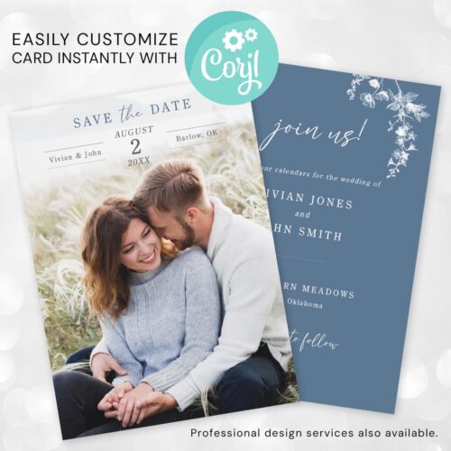 Wedding Save the Date Template Floral Design Blue Pattern Custom Editable Photo Card Instant Download