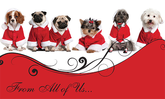 The From All All Us Puppies Holiday Postcard is an adorable collection of Santa’s Little Helpers dressed in their Christmas best!