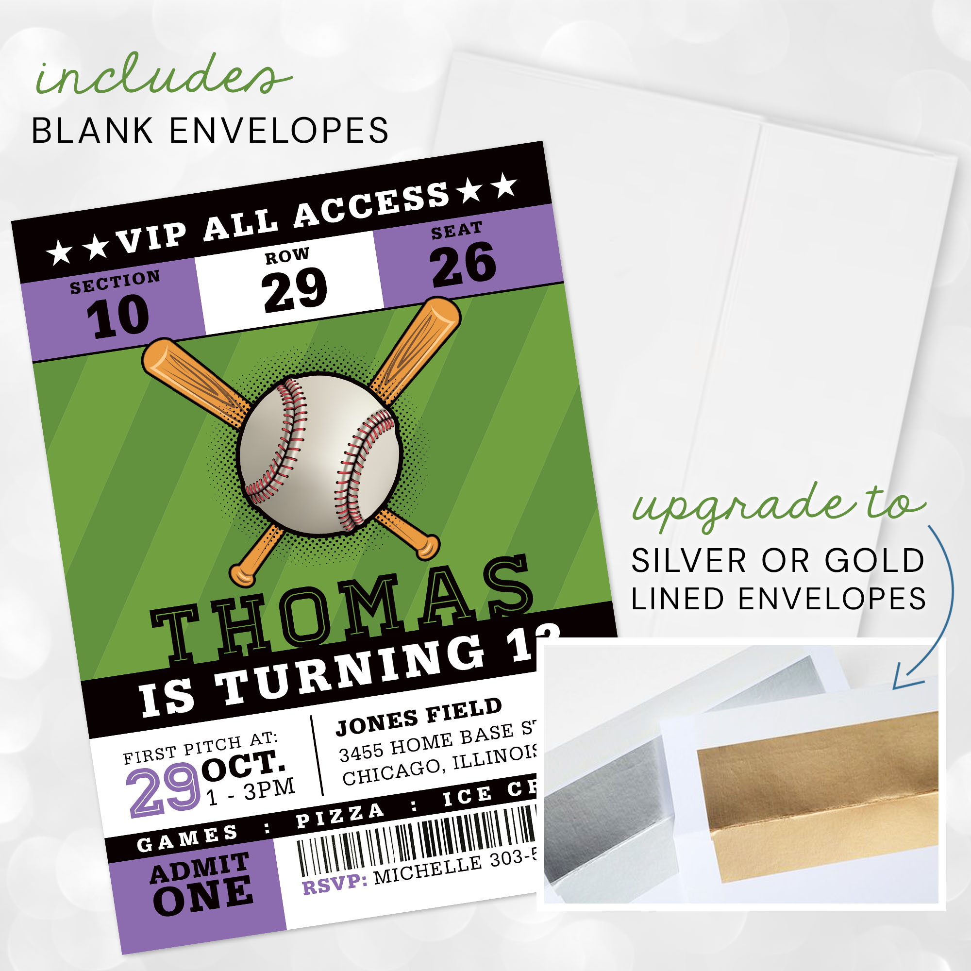 Enhance your Baseball Ticket Invitation Card by upgrading your envelopes, adding your return address, or print guest recipient addresses directly on the envelopes. Please message us for more information on these time-saving upgrades!