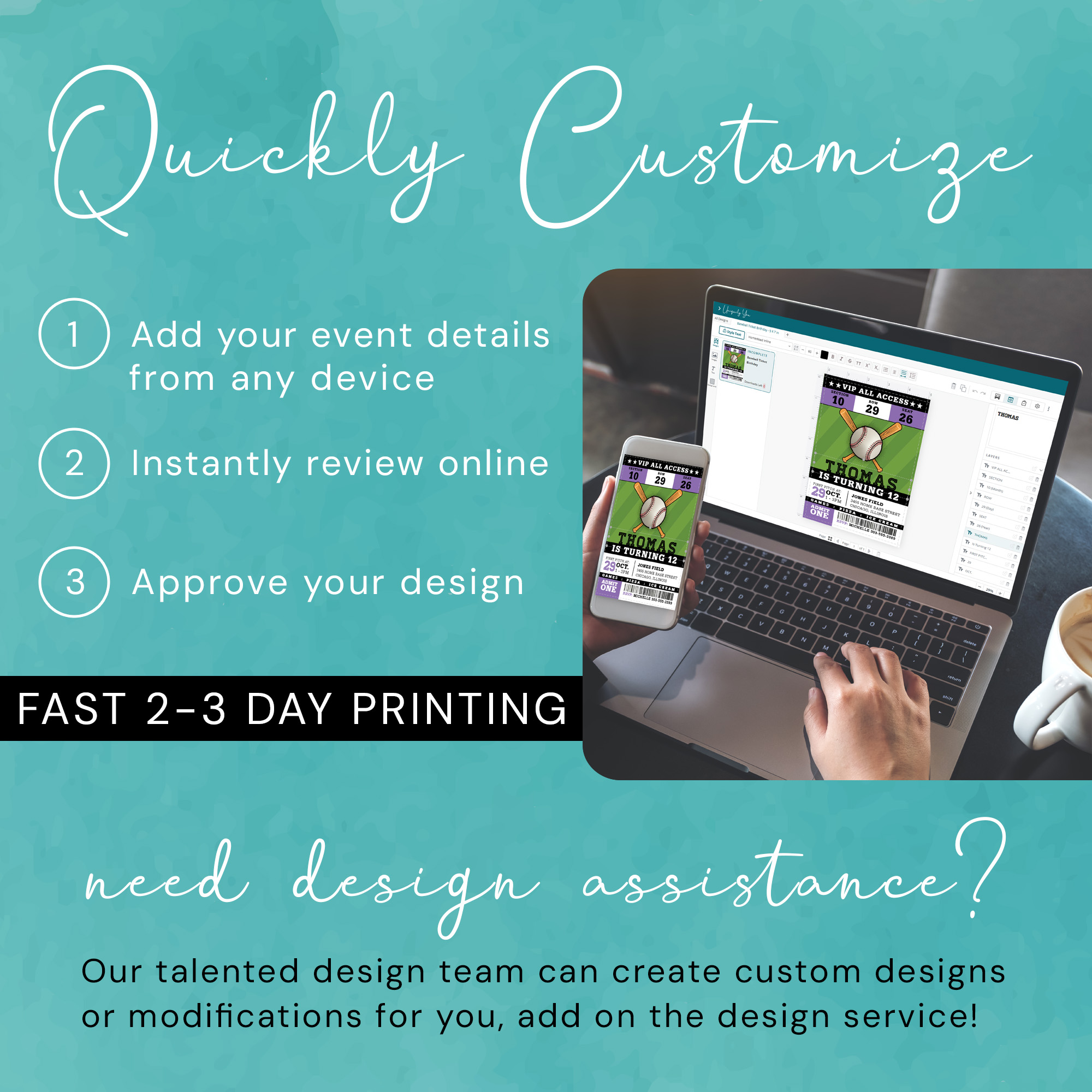 – Our professional design team is here to help you create additional cards, party signage, party favors and any additional items you may need. Please ask us for a quote!