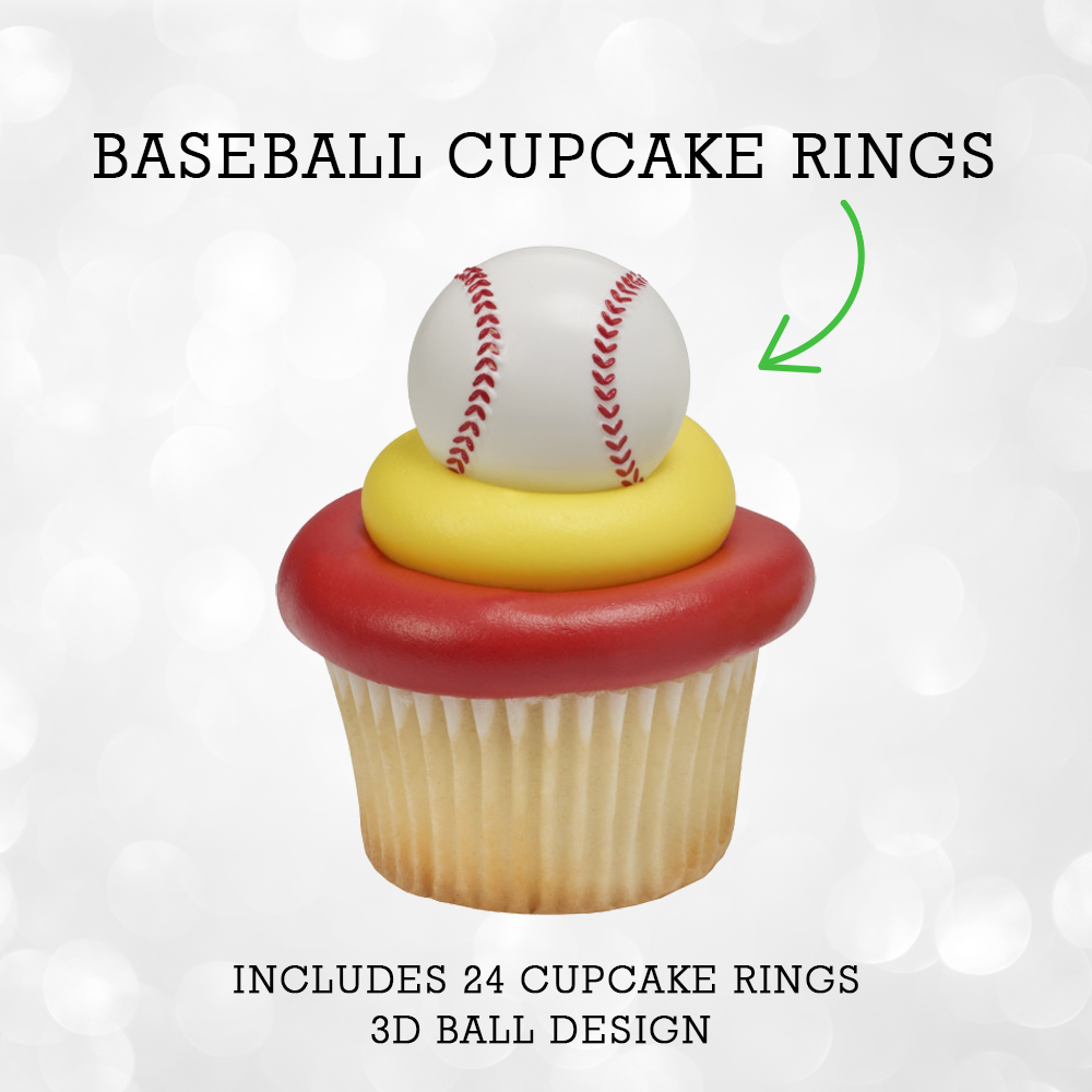🎉24 plastic cupcake rings featuring a 3D Baseball design with red laces and white ring details