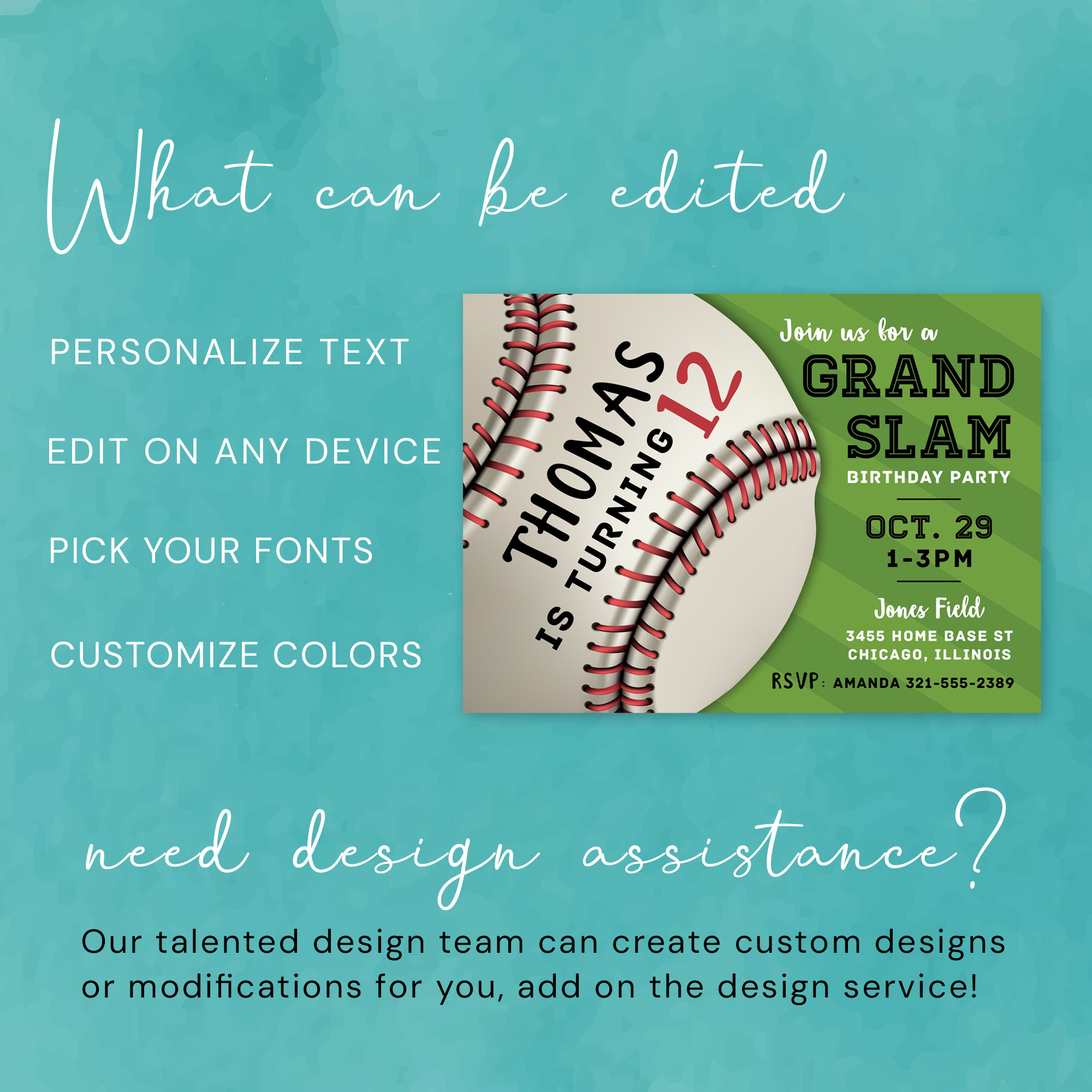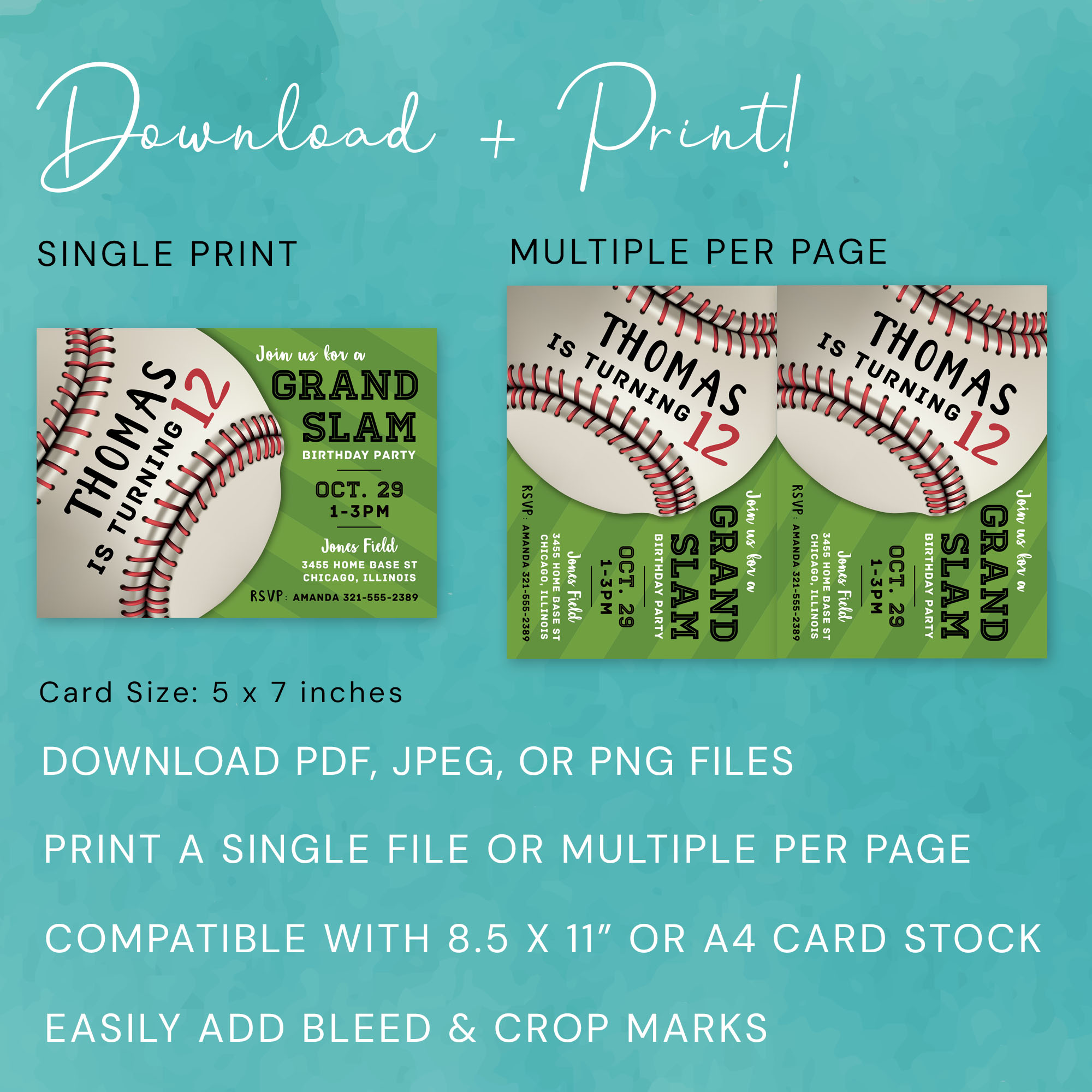 ➡️ Digital template featuring a baseball grand slam design with all your party details