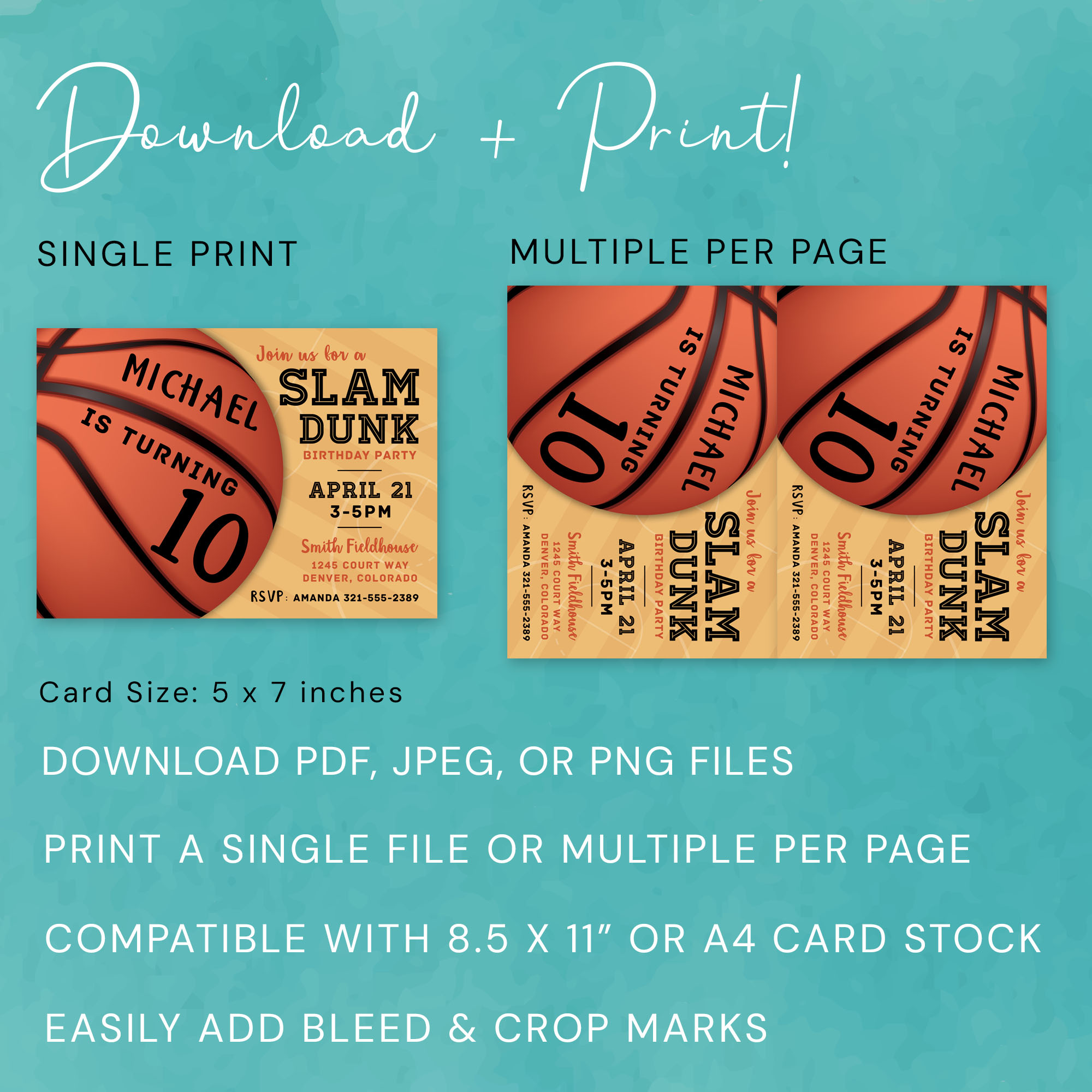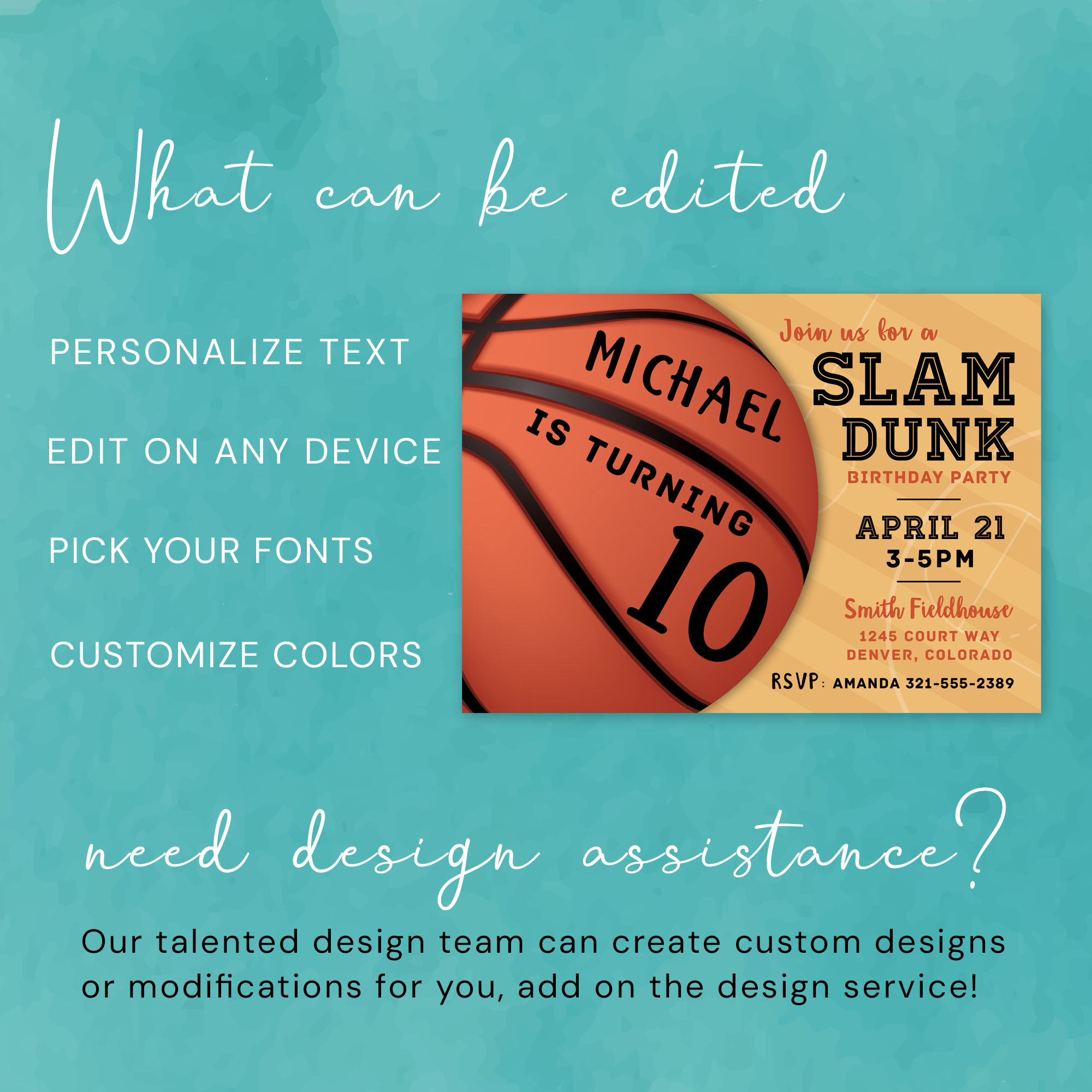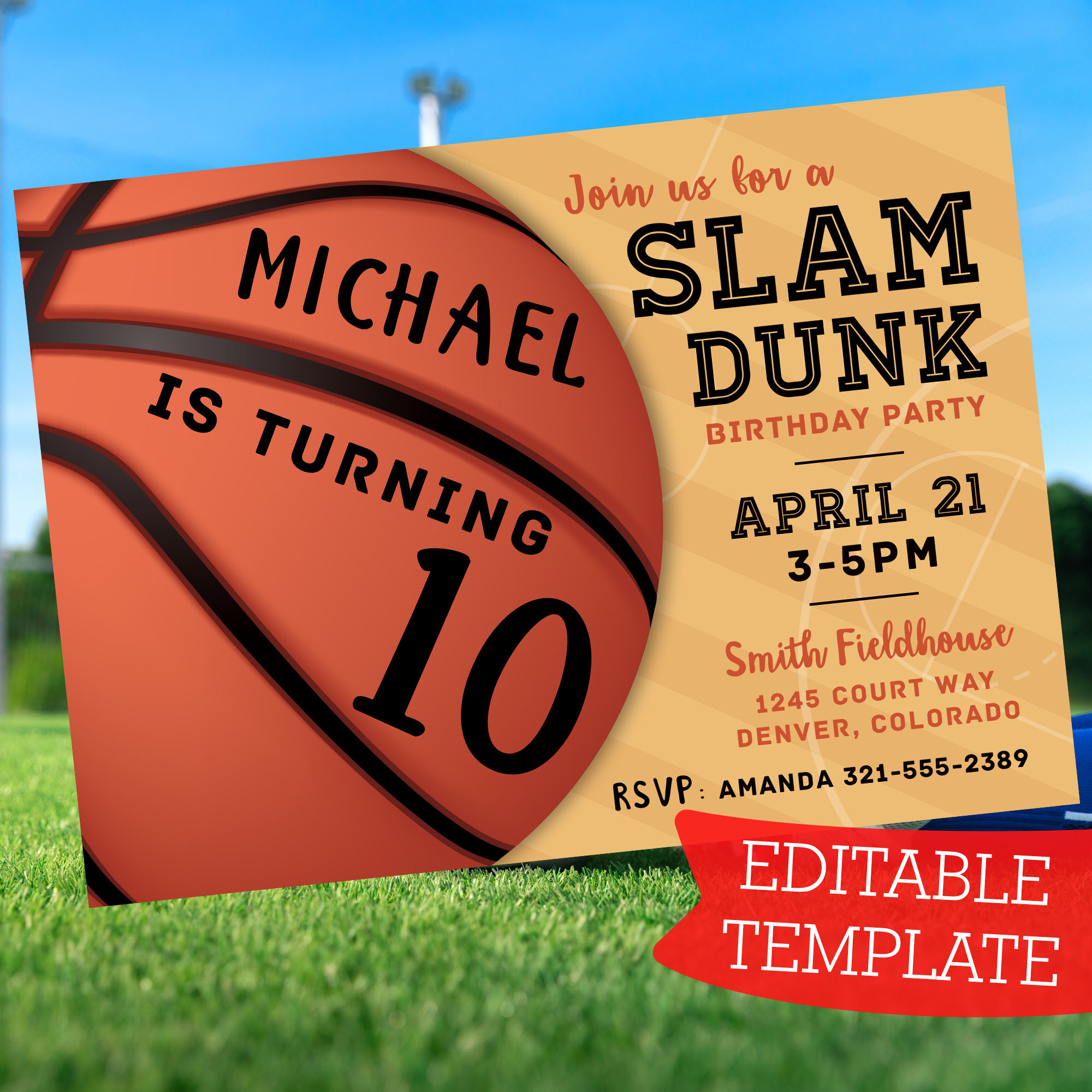 ➡️ Digital template featuring a basketball slam dunk design with all your party details