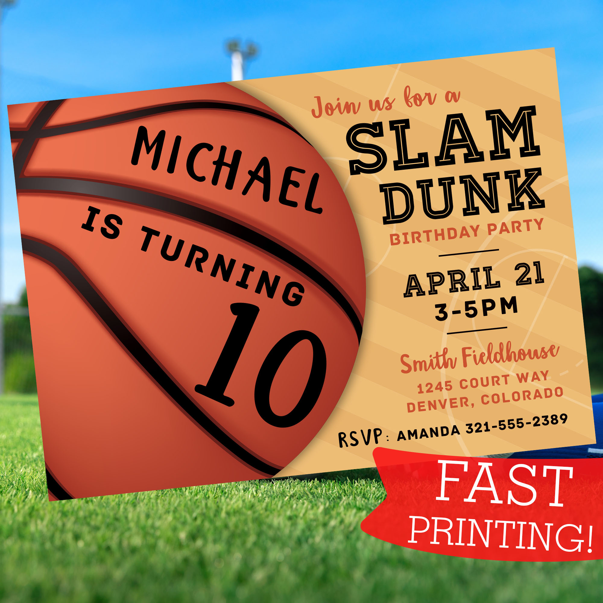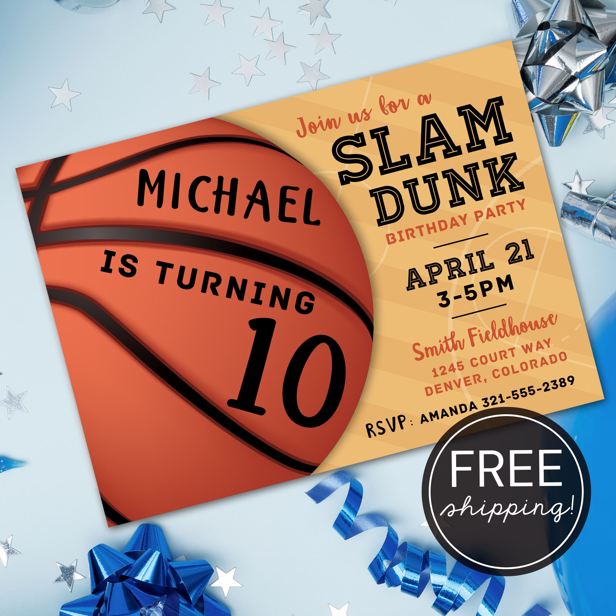 ➡️ Eye-catching design featuring a basketball and “Slam Dunk Birthday Party” header
