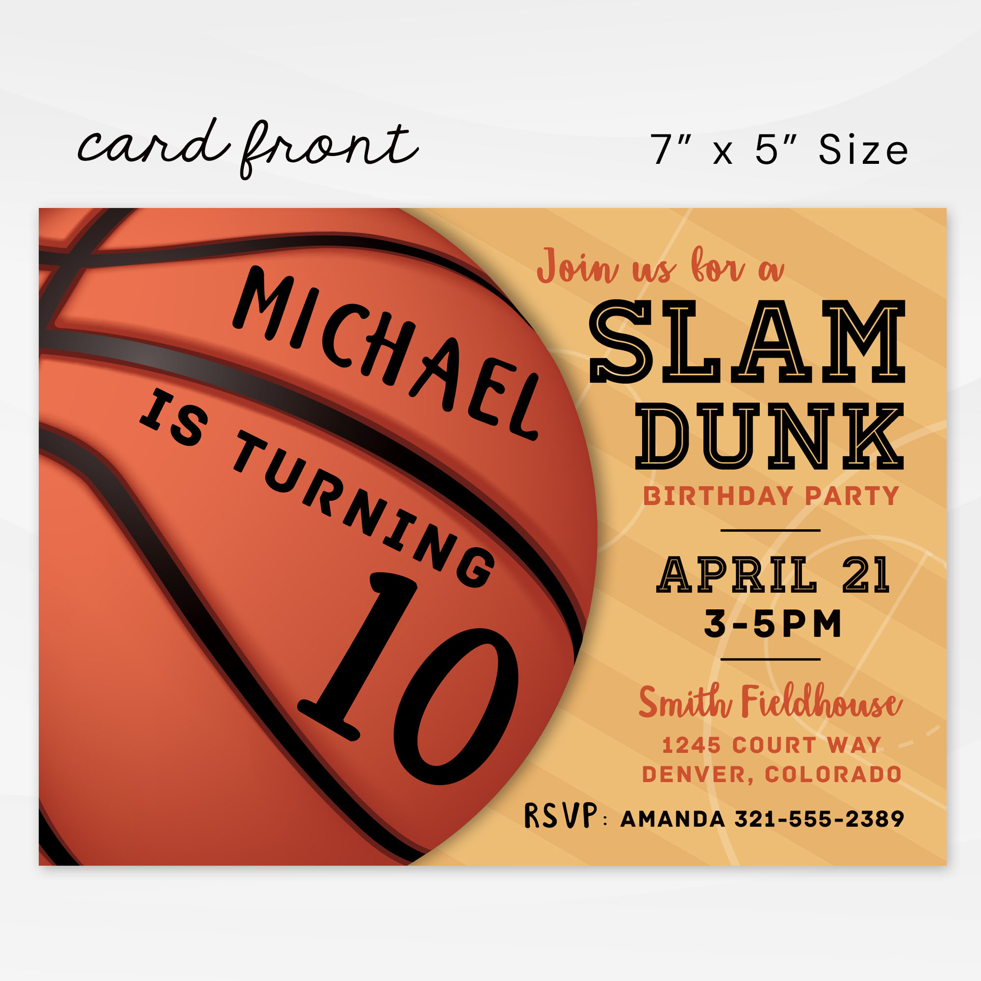 – YES, most wording can be completely customized to whatever you need. You can easily personalize the Basketball Slam Dunk Invitation card yourself using our DIY Online Editor or request our Designer Customization Service and we will handle all of the details for you.