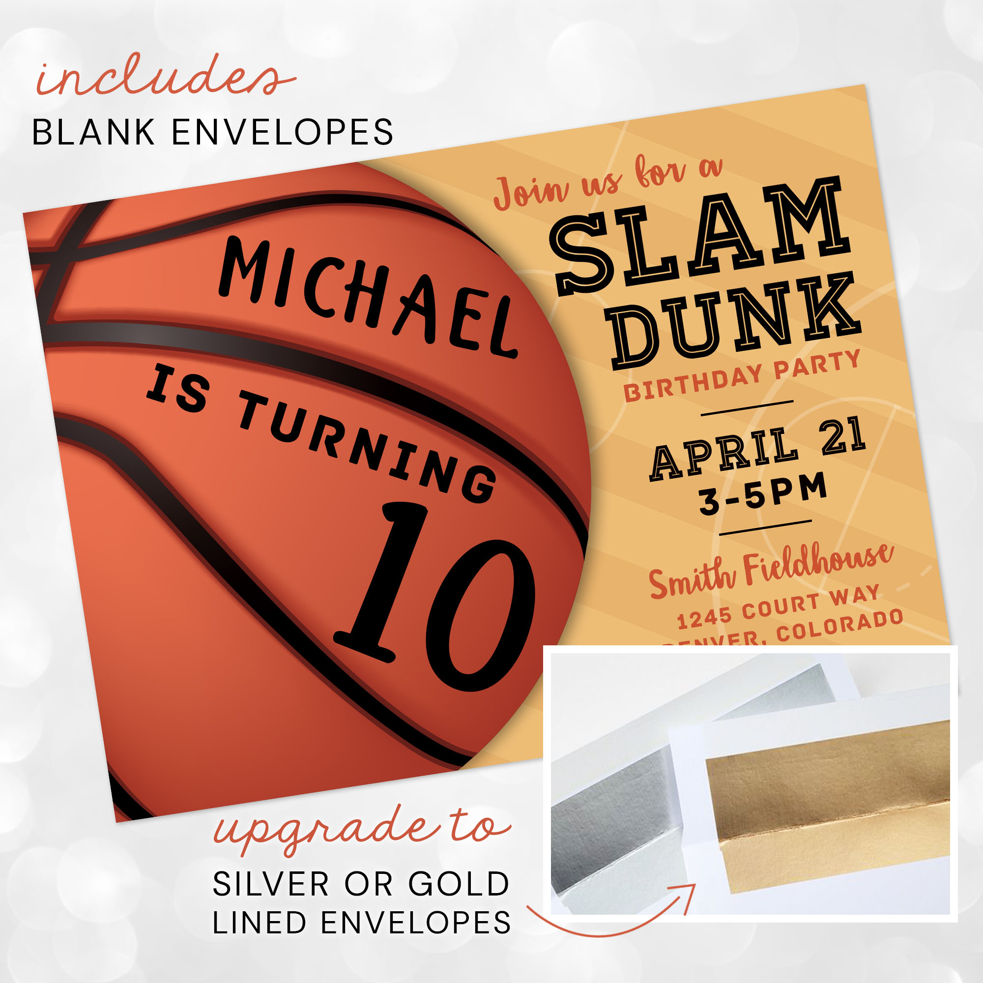 Enhance your Basketball Slam Dunk Invitation Card by upgrading your envelopes, adding your return address, or print guest recipient addresses directly on the envelopes. Please message us for more information on these time-saving upgrades!