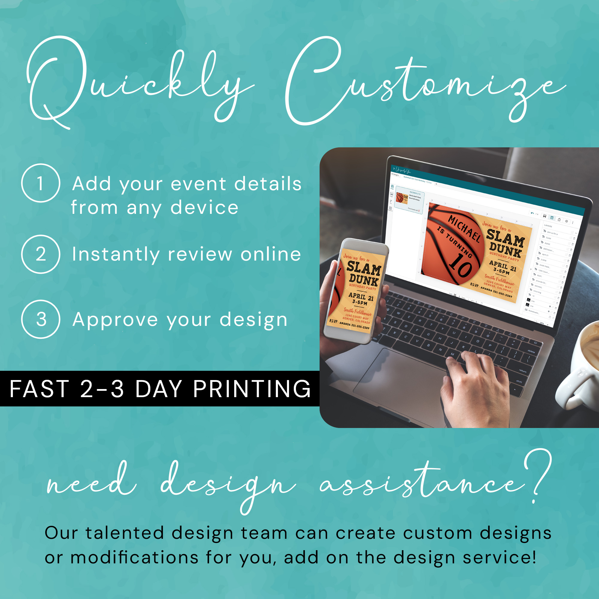 * DIY Online Editor: Use our custom online editor to easily add your event details and personalization to your Basketball Slam Dunk Invitation card. Our design team is here to assist you every step of the way if you have any questions. Try a demo of our online editor: https://www.corjl.com/d/ww2pzt