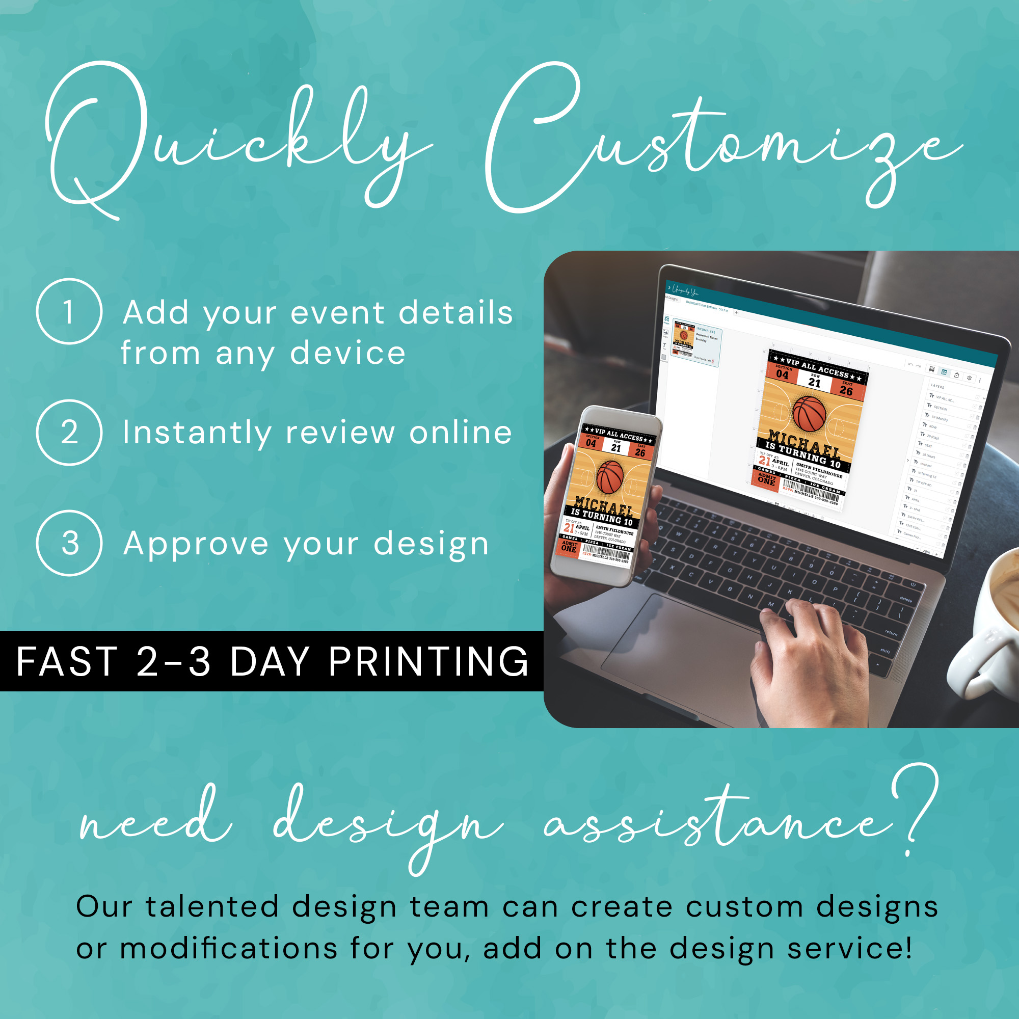– Our professional design team is here to help you create additional cards, party signage, party favors and any additional items you may need. Please ask us for a quote!