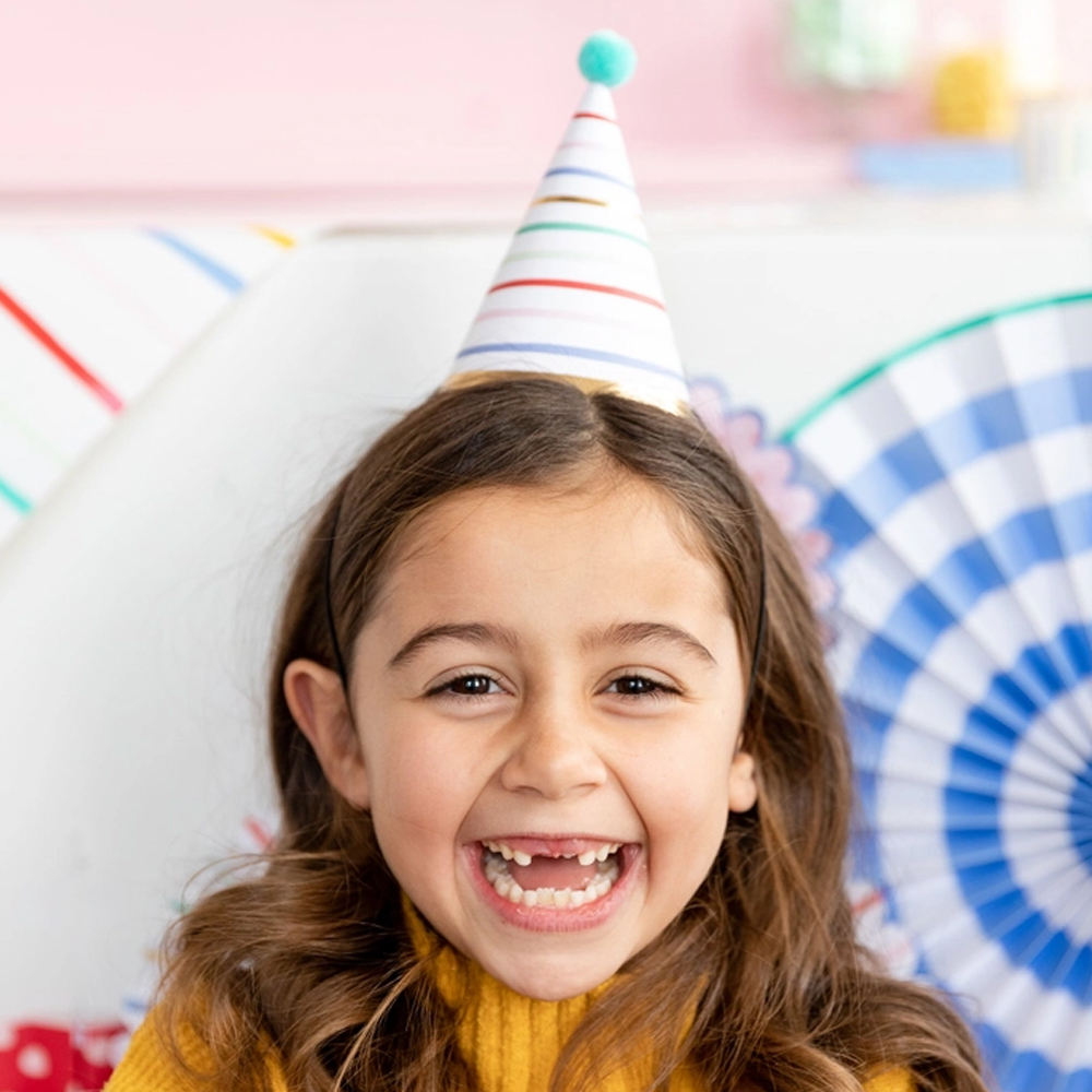 * Cheerful 5.5″ Striped Party Hats: 8 Qty (Gold Foil Accents and Pink & Blue Pom Poms)