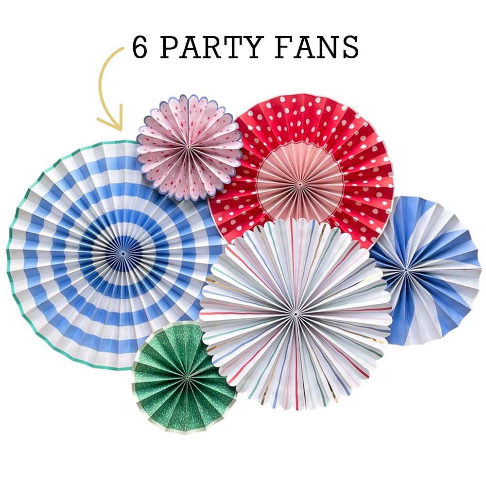 * Celebration Paper Party Fans: 6 Qty (Double Sided with 1 – 17″, 2 -14″, 2 – 11″ and 1 – 8″ fan)