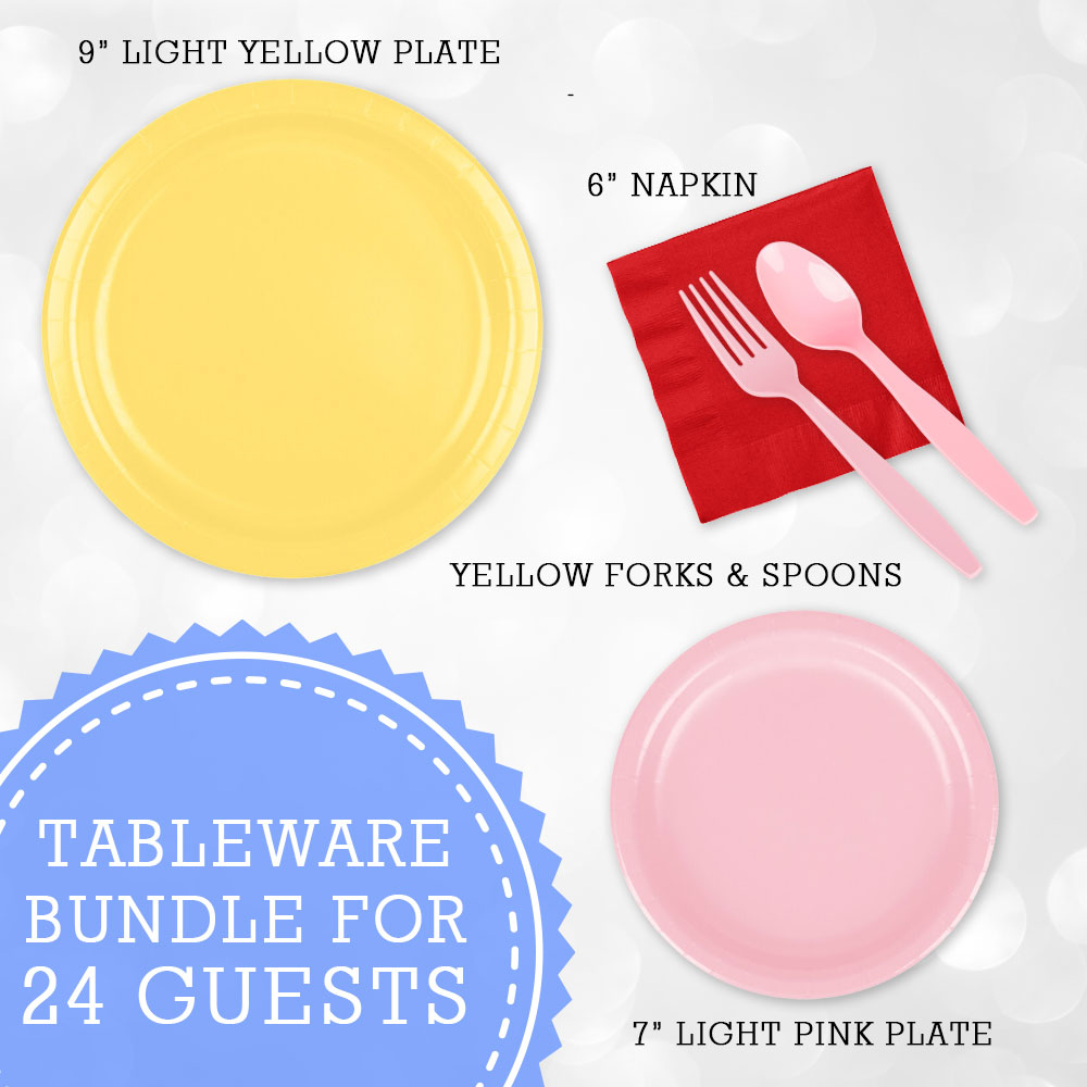 🥳 Premium 9-inch yellow plates and 7-inch pink dessert plates, complete with matching pink cutlery set for 24 guests