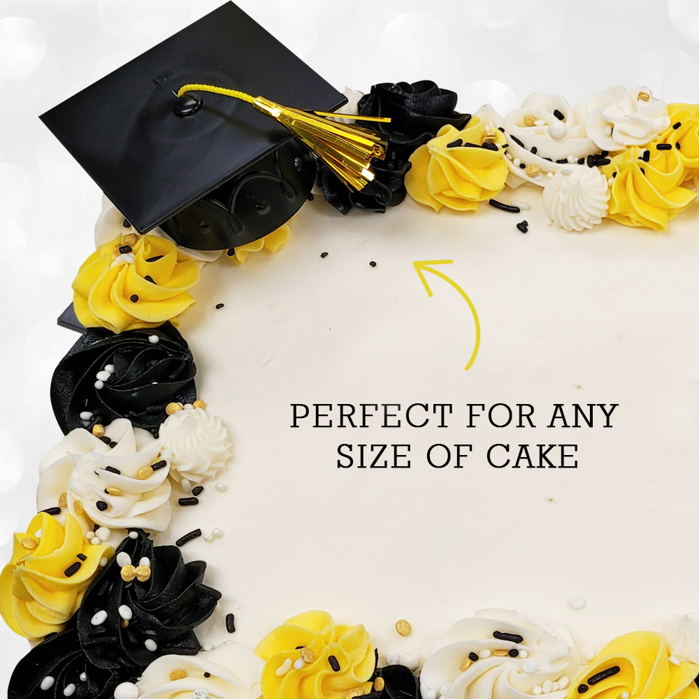 Elevate your graduation cake into a truly memorable centerpiece with this elegant gold Congrats Grad cake topper featuring a vertical design. This versatile party set also includes a coordinating black graduation cap with gold tassel that can be used for cake or table decor.