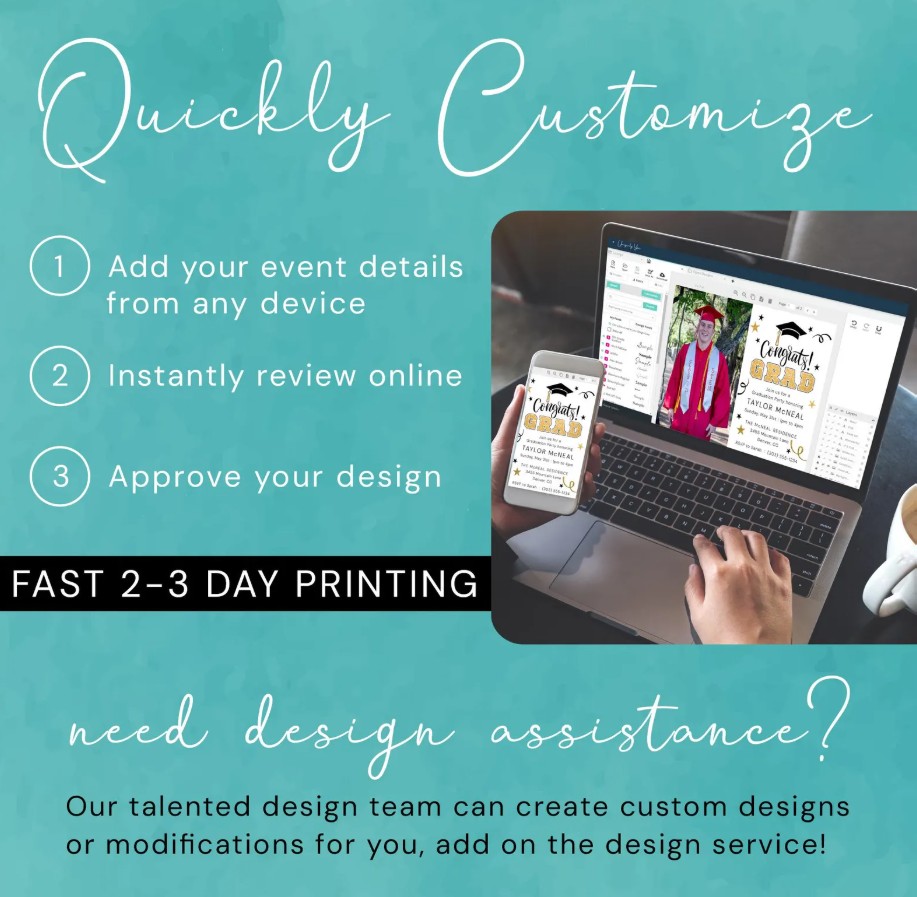 * DIY Online Editor: Use our custom online editor to easily add your event details, photos, and personalization to your Graduation Party Invitation card. Our design team is here to assist you every step of the way if you have any questions. Try a demo of our online editor: https://www.corjl.com/d/FAdSWN