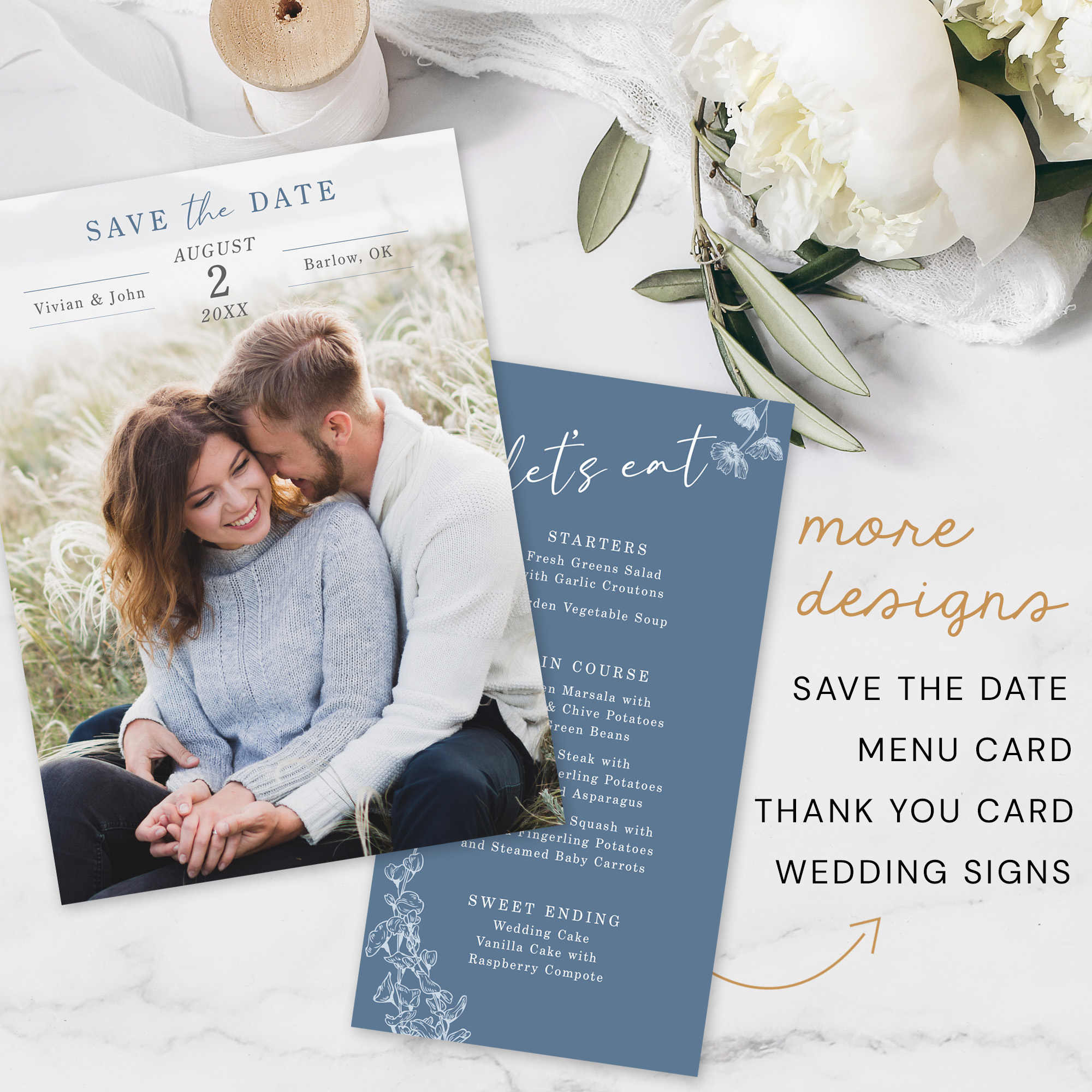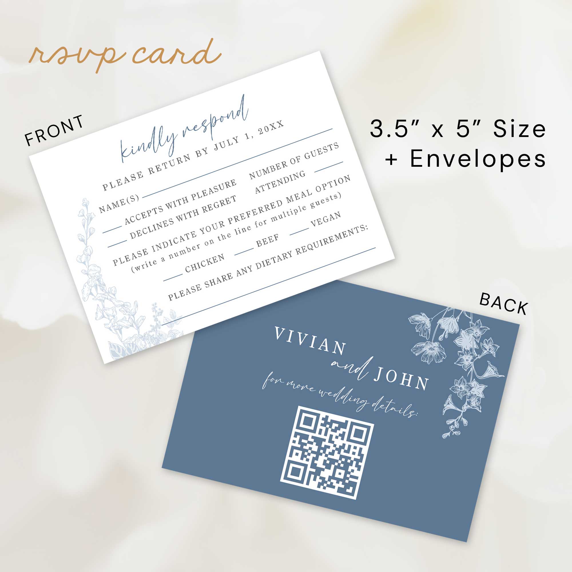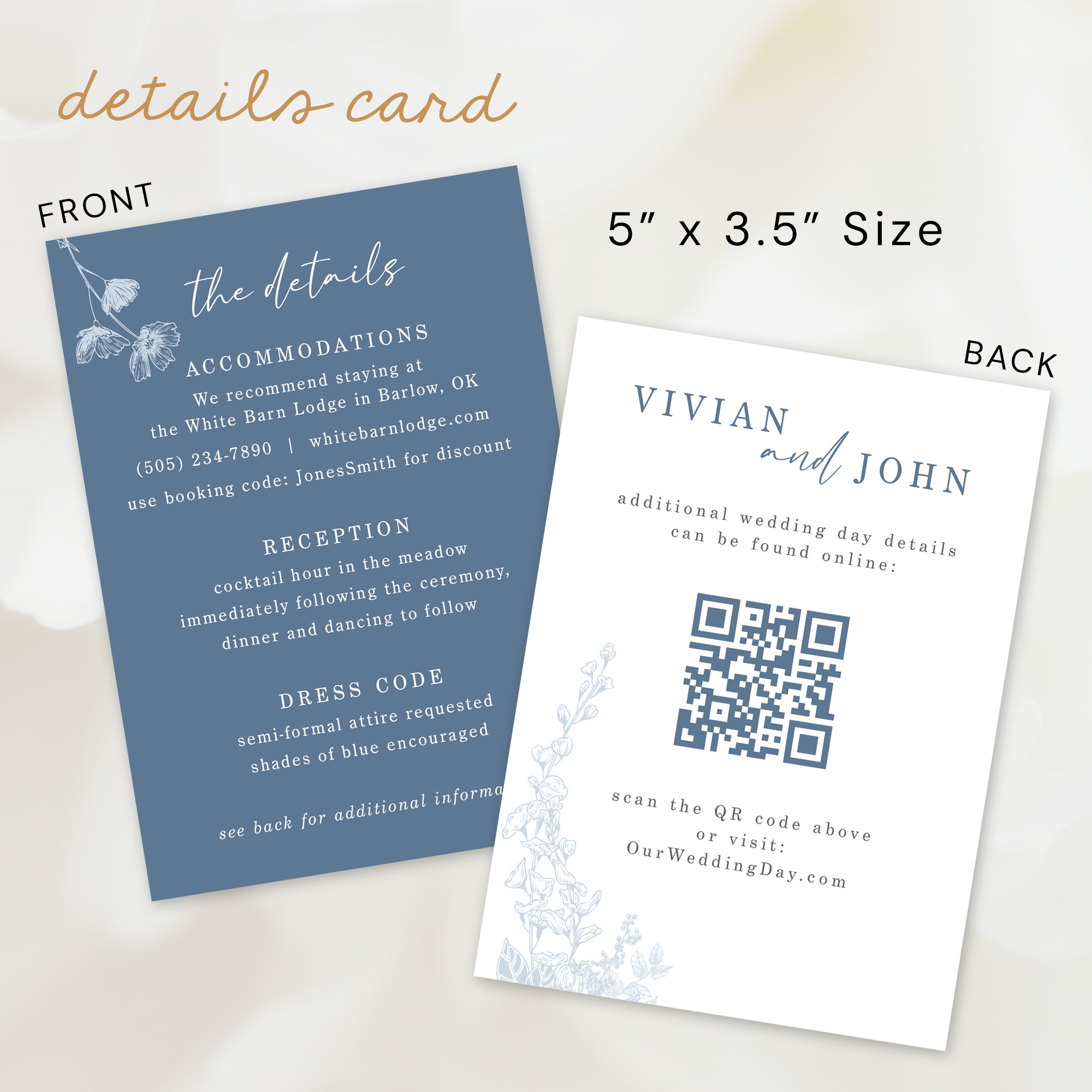 This elegant wedding stationery set includes your choice of a printed 5×7 inch invitation with envelope, a 3.5×5 inch RSVP card with envelope, and/or a 5×3.5 inch wedding details card, all featuring a minimalist blue floral design. This professionally printed wedding invitation package offers high-quality, ready-to-send wedding stationery.