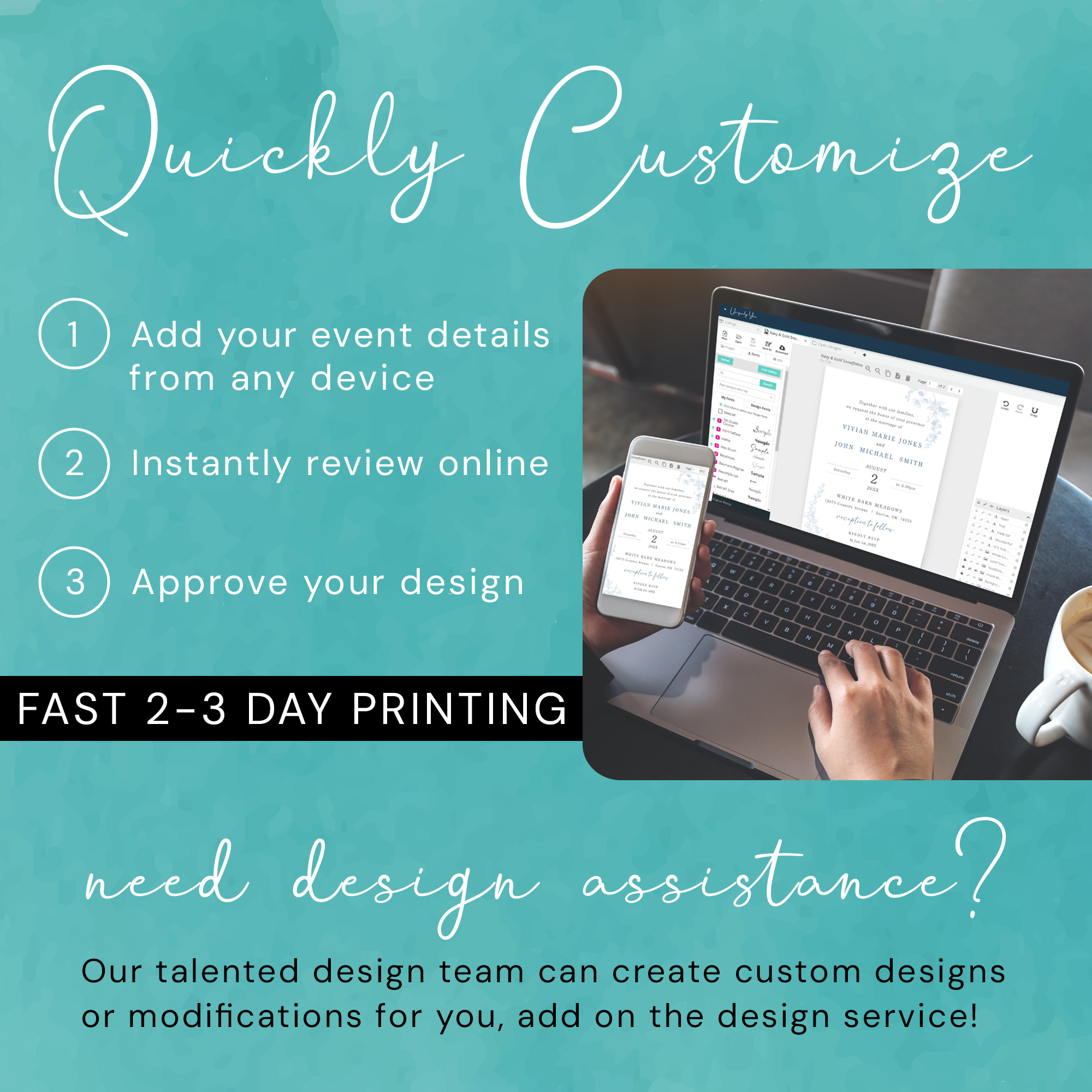 - Designer Customization Service: If you prefer our design team to customize your invitation and details for you, or if you would like to request a custom color or design modification, please message us for a quote. Our team will send you a proof with your desired customizations to approve within 2 business days.