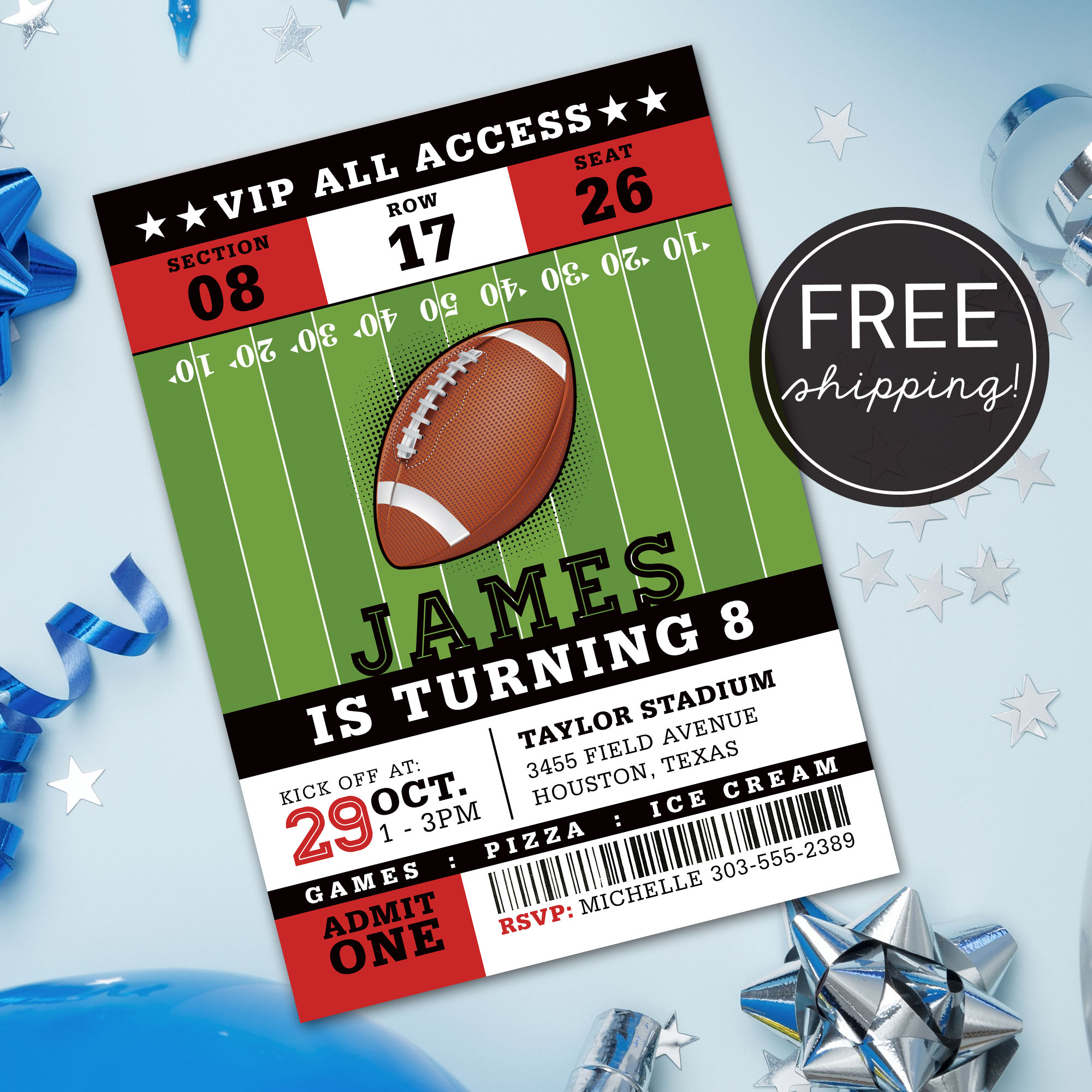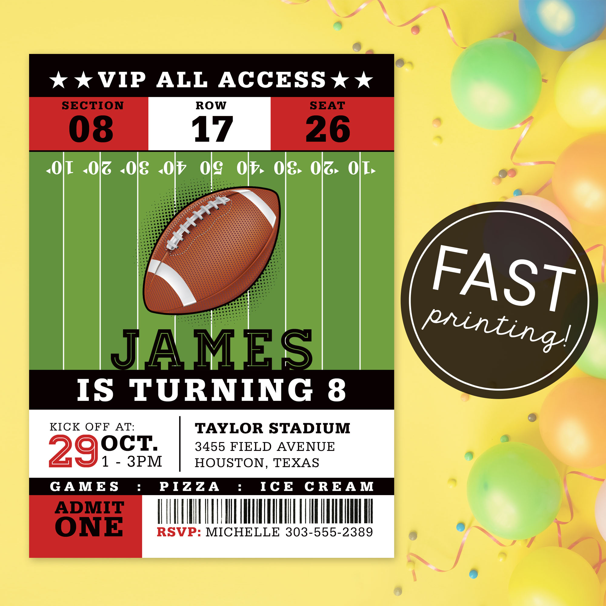 * DIY Online Editor: Use our custom online editor to easily add your event details and personalization to your Football Ticket Invitation card. Our design team is here to assist you every step of the way if you have any questions. Try a demo of our online editor: https://www.corjl.com/d/f6diEf