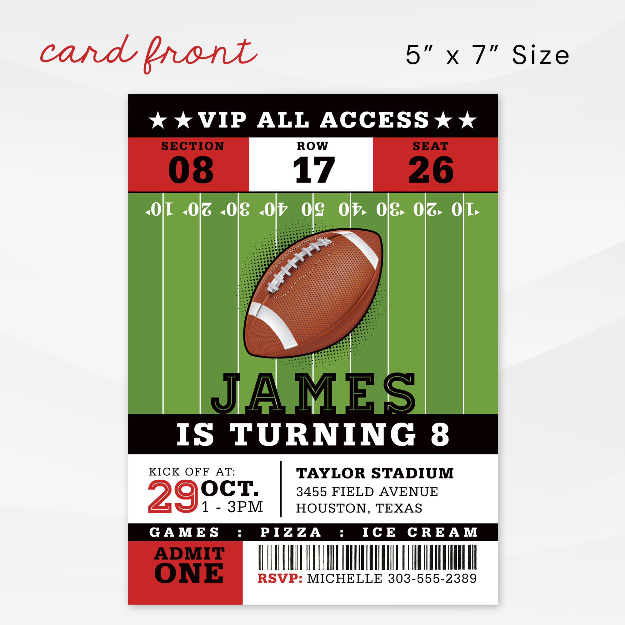– YES, most wording can be completely customized to whatever you need. You can easily personalize the Football Ticket Invitation card yourself using our DIY Online Editor or request our Designer Customization Service and we will handle all of the details for you.