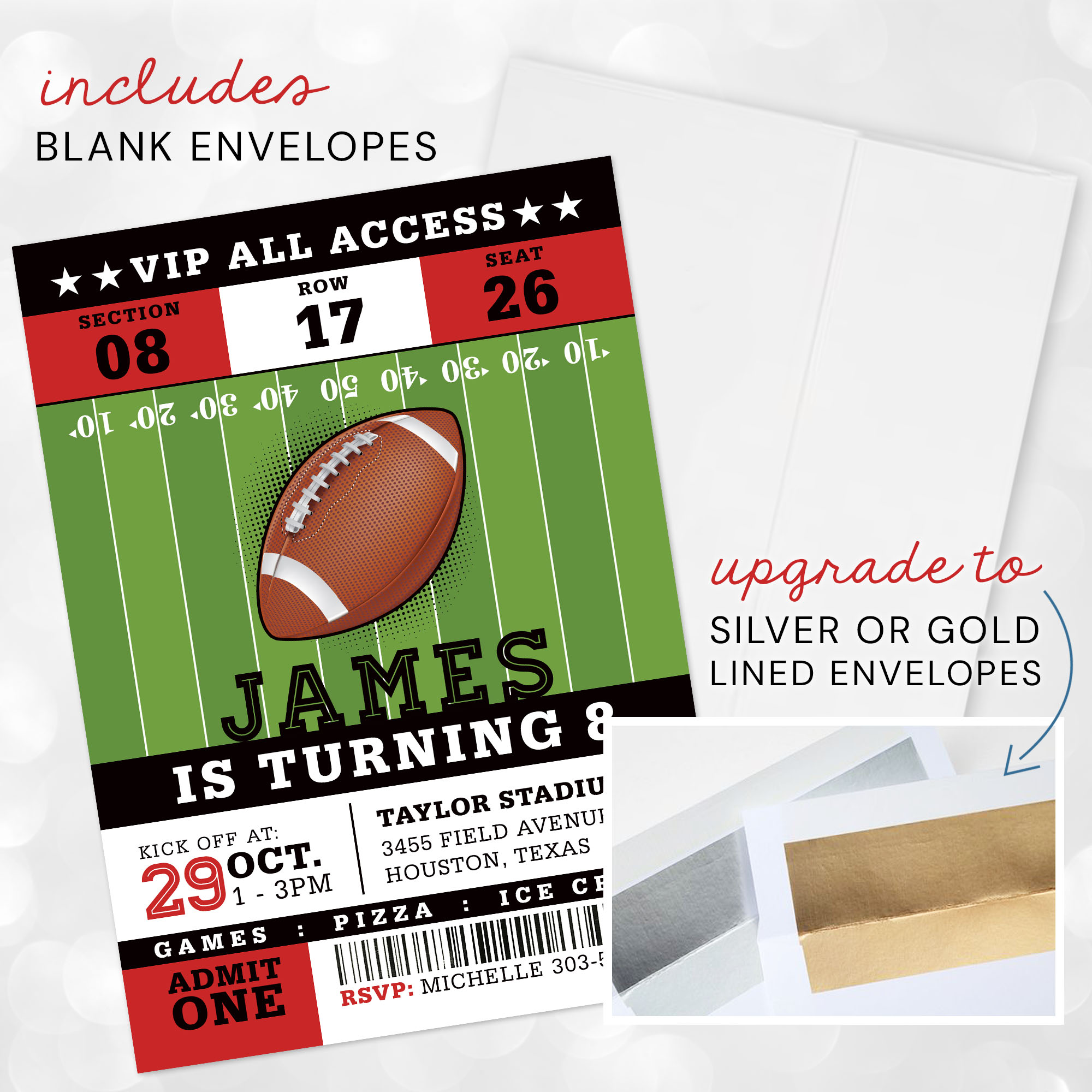 Enhance your Football Ticket Invitation Card by upgrading your envelopes, adding your return address, or print guest recipient addresses directly on the envelopes. Please message us for more information on these time-saving upgrades!