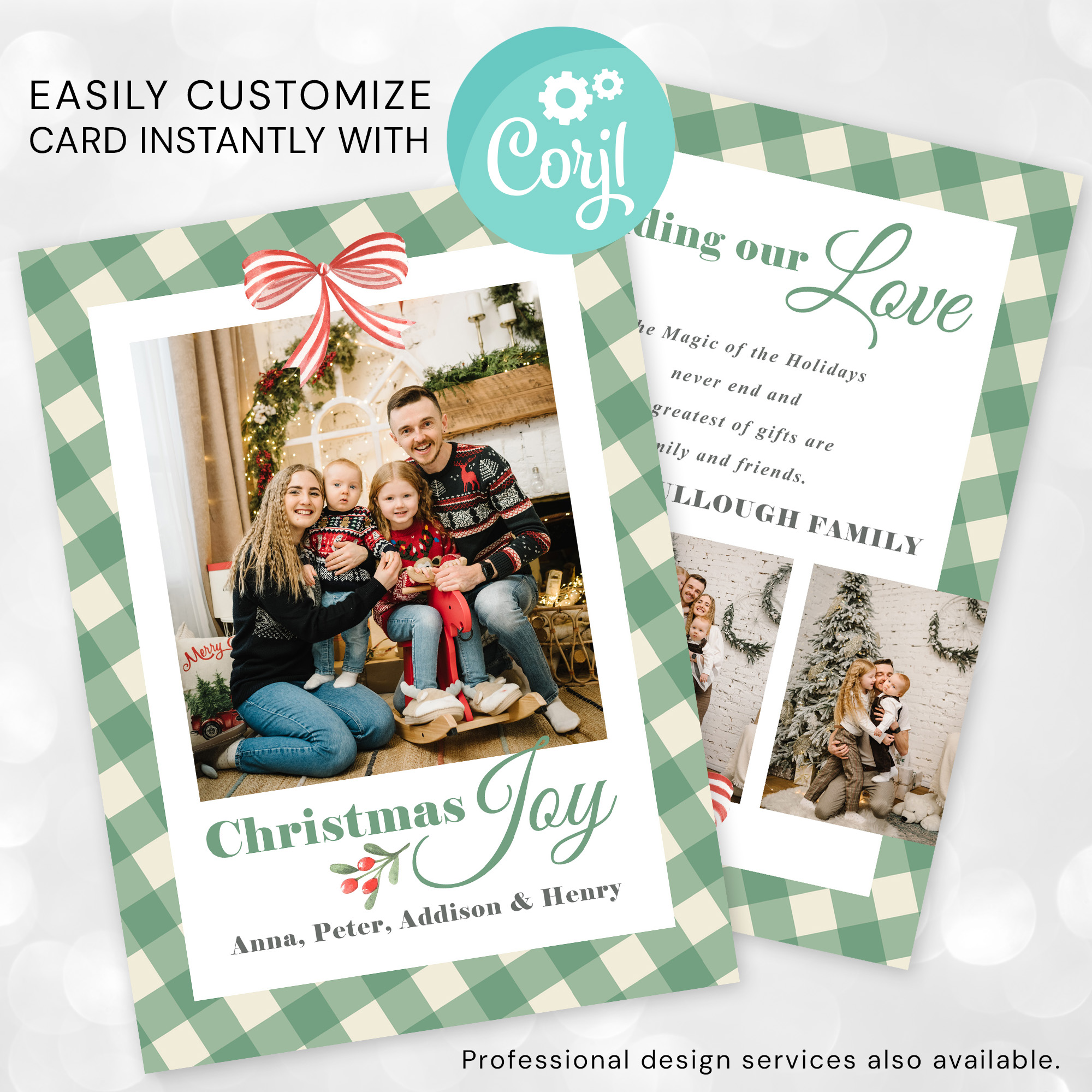 Share the spirit of the season with our Gingham Holiday Photo Card template featuring a trendy gingham Christmas Joy design, perfect for creating a custom greeting digital download. This double-sided card showcases your family portrait on the front while offering space for three additional photos and a personalized holiday message on the back, complete with a beautiful coquette bow and holly for a festive touch.