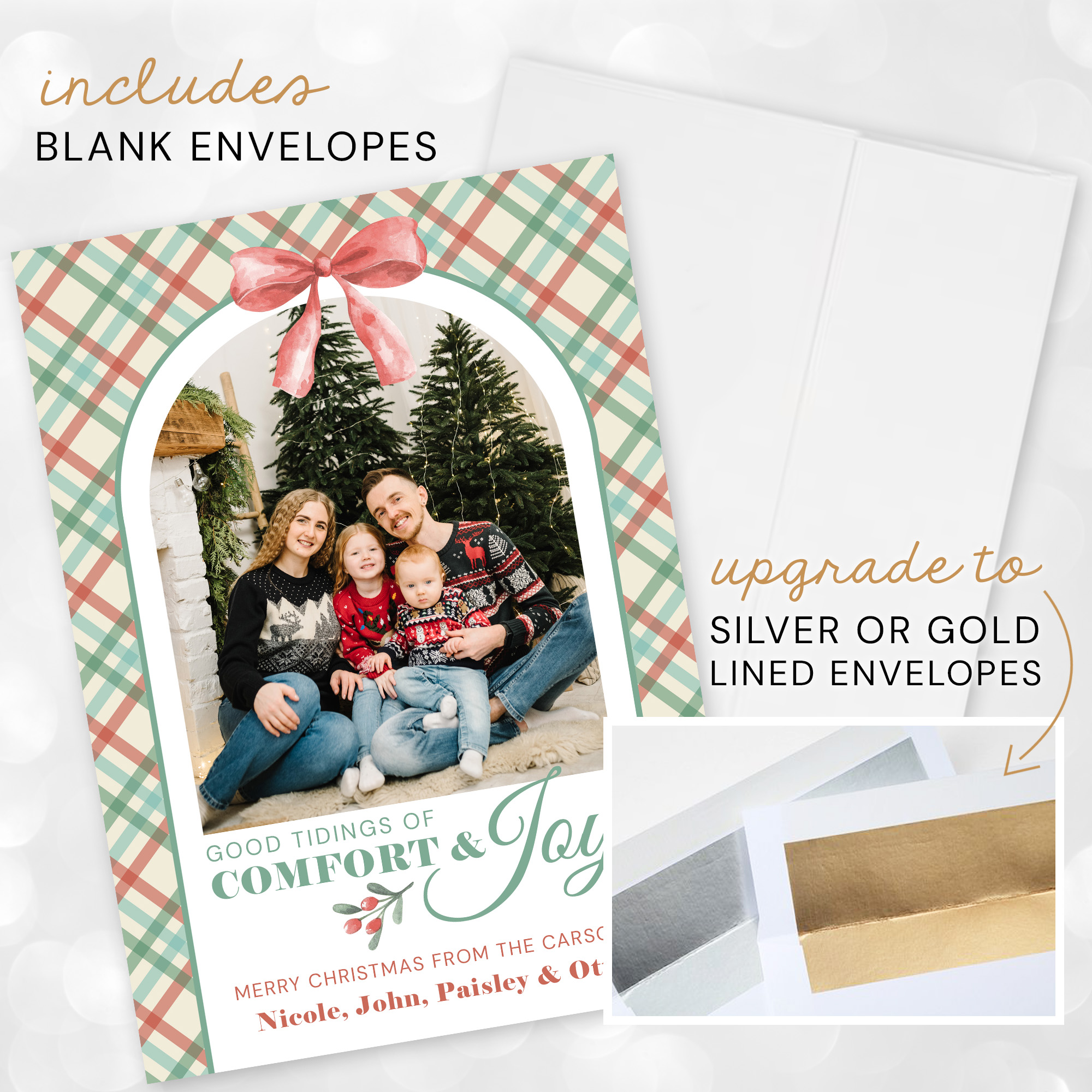 π Modern gingham design featuring “Good Tidings of Comfort & Joy” and Luke 1:14 scripture