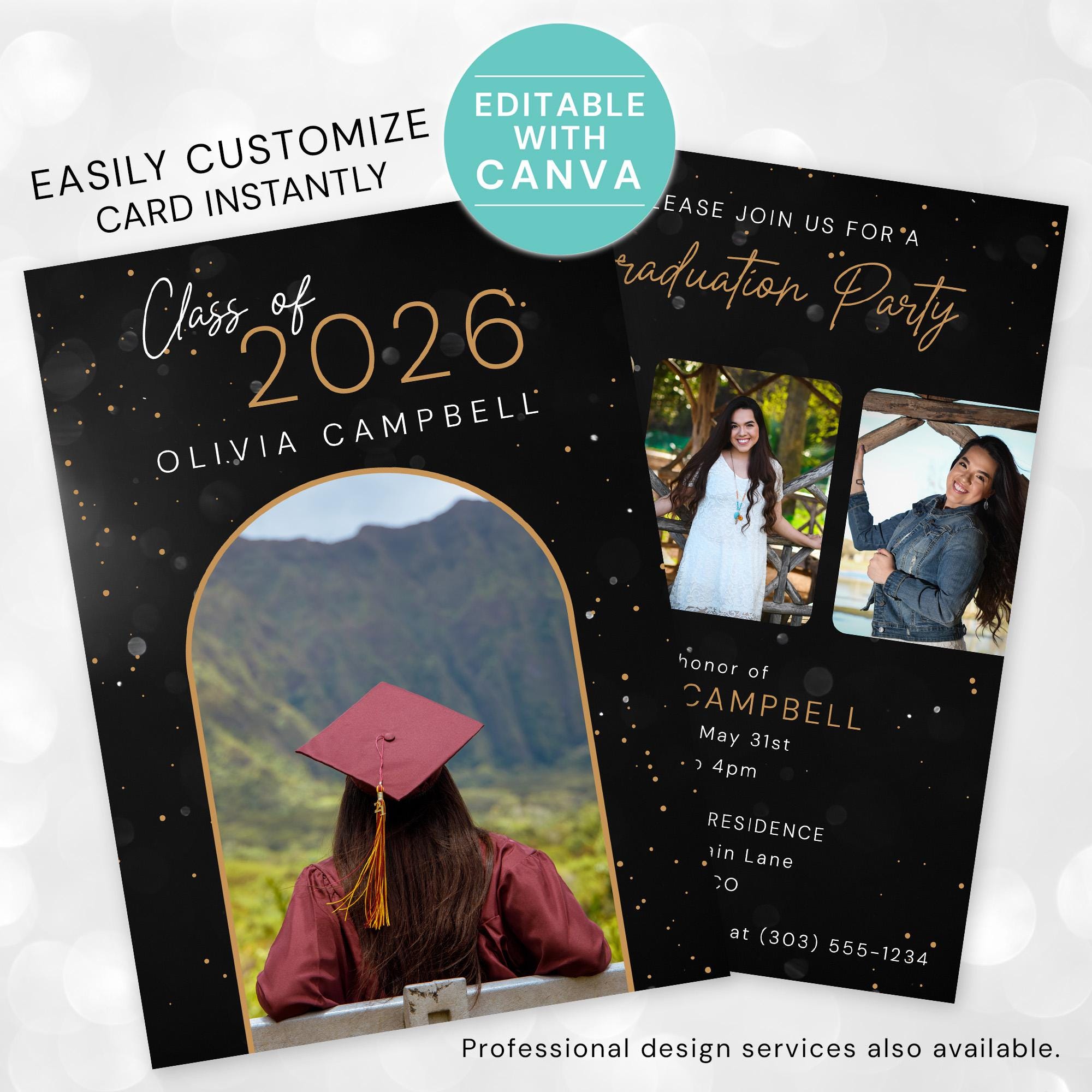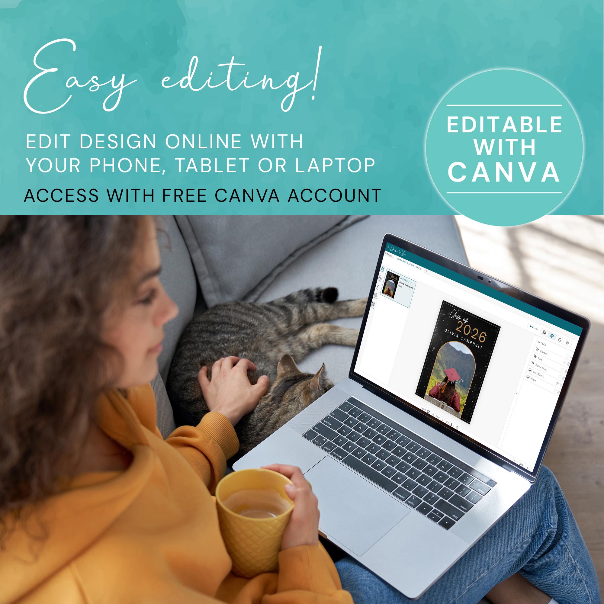 Celebrate your graduate in style! This elegant Black and Gold Graduation Party Invitation is a fully editable Canva Template, allowing you to customize everything from the photos to the party details in just minutes.