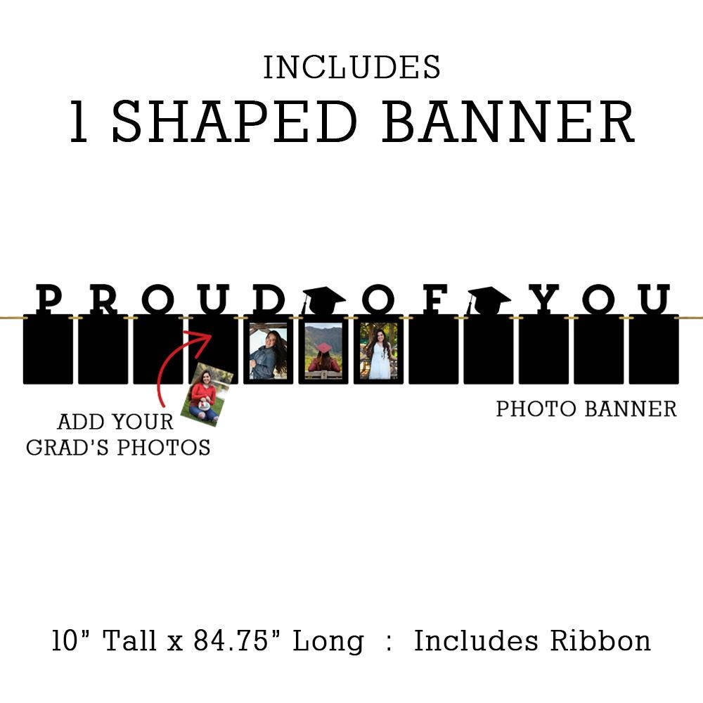Showcase your graduate's favorite memories with our "Proud of You" Graduation Photo Banner. This unique, interactive decoration allows you to add twelve of your own photos to create a personalized centerpiece for your celebration.