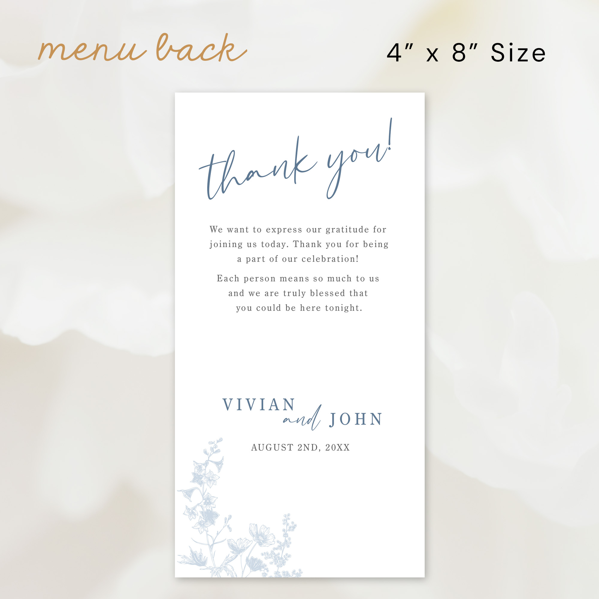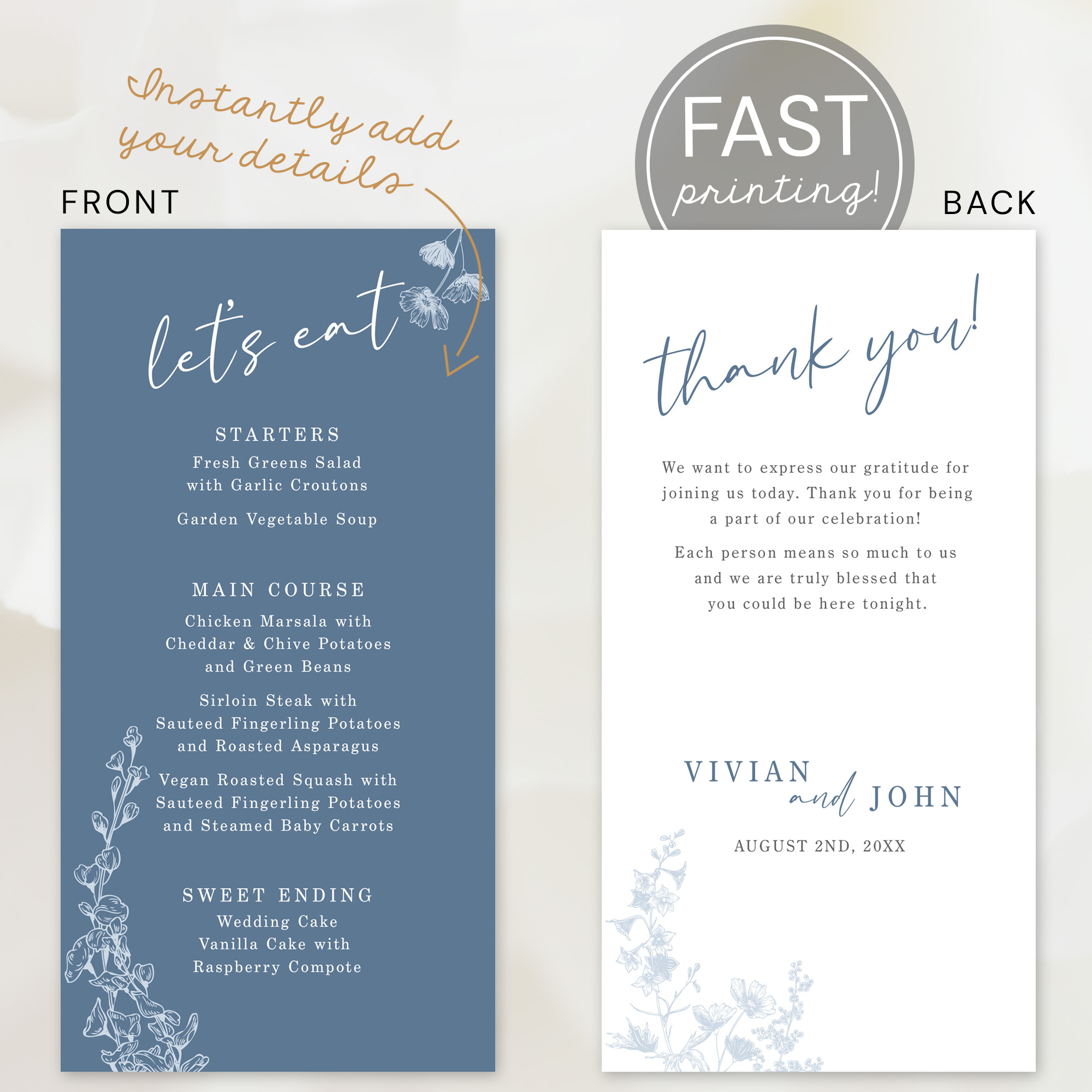 This elegant wedding menu card features a dusty blue background and beautiful white floral illustrations, perfect for reception table decor. It includes sections for starters, main course, and dessert, and the wording is customizable to match your menu offerings. Optional back design for thank you message or event program.