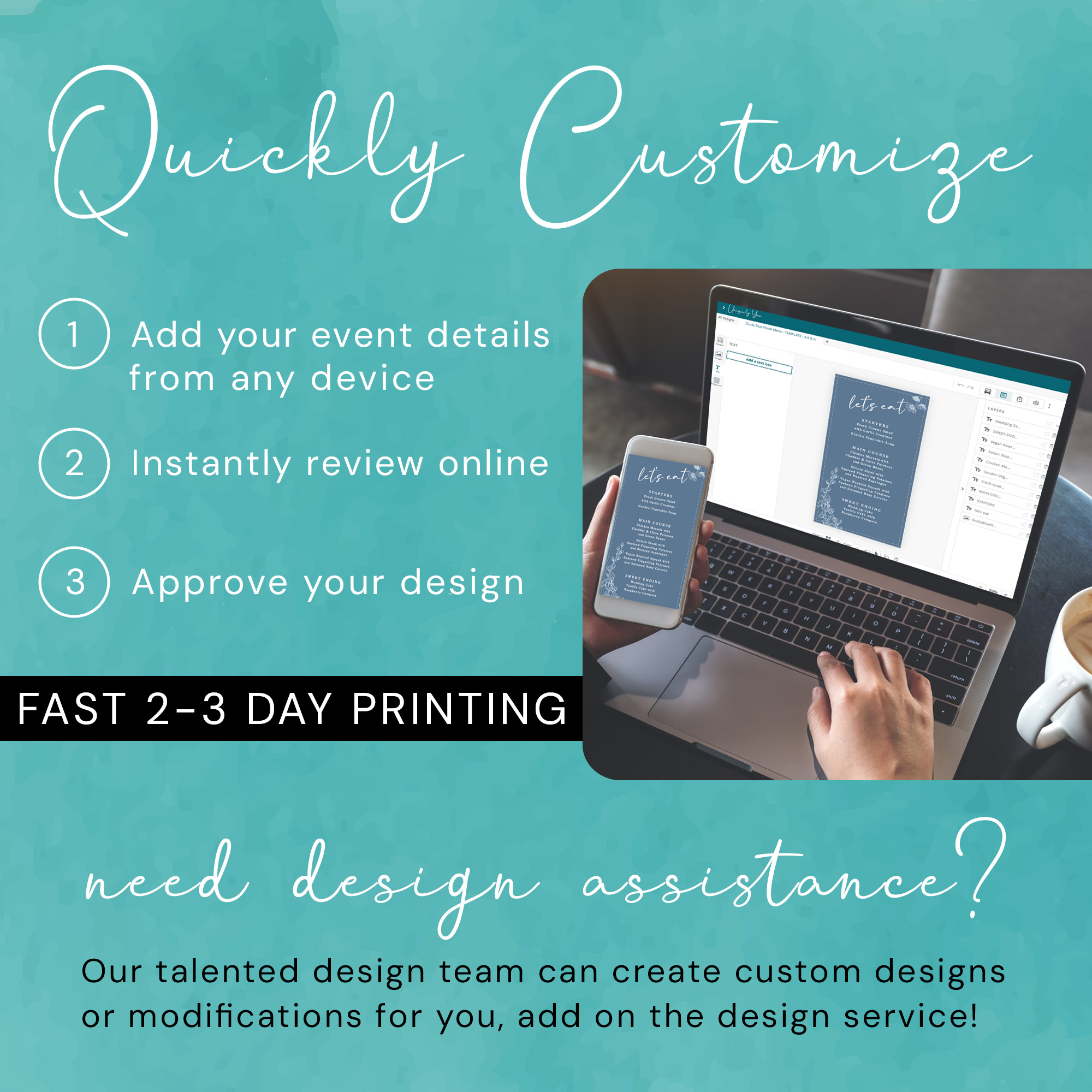 * DIY Online Editor: Use our custom online editor to easily add your menu details, thank you message and personalization to your Menu Card. Our design team is here to assist you every step of the way if you have any questions. Try a demo of our online editor here: https://www.corjl.com/d/3L058P
