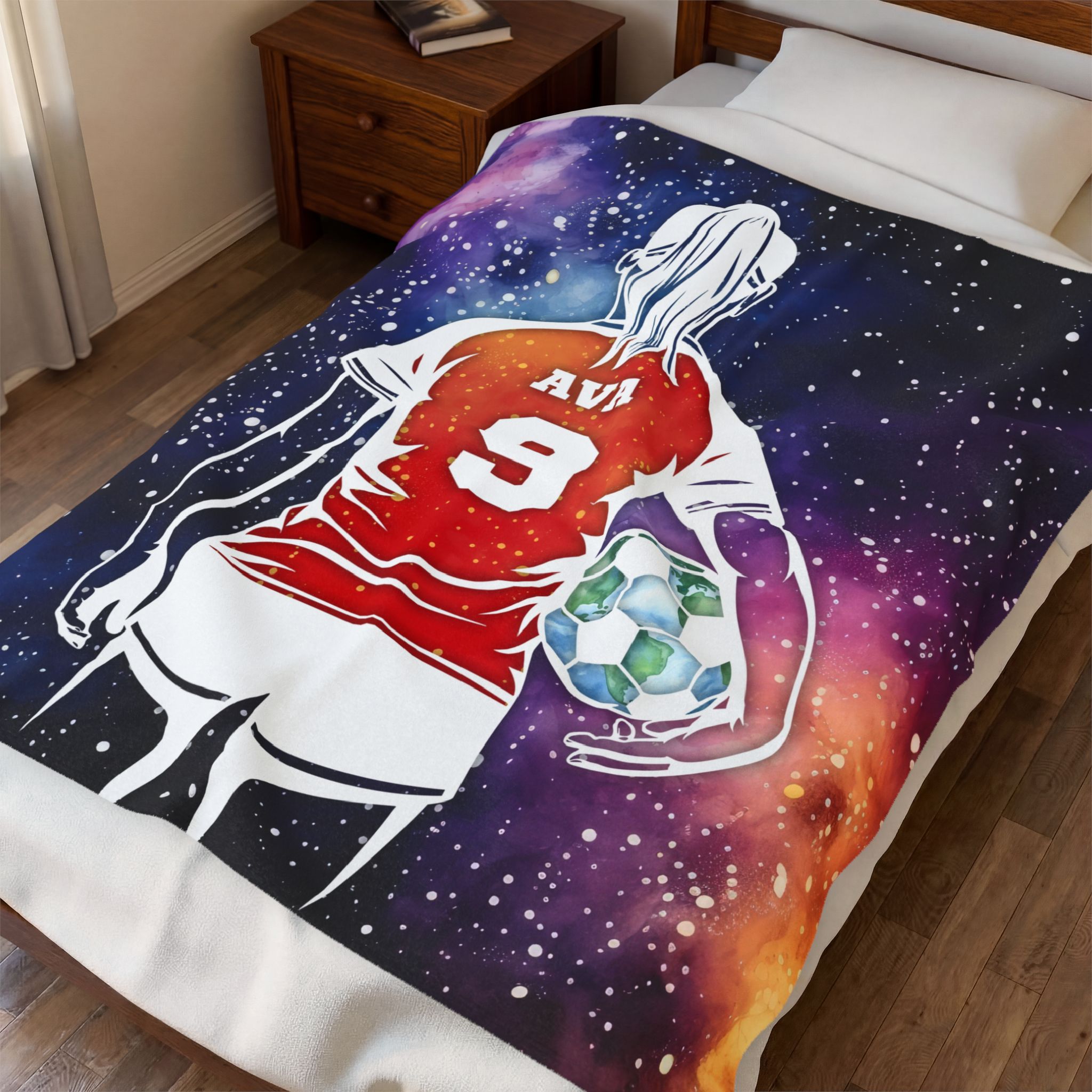 Wrap yourself in a velvety blanket that feels like a quiet late-night victory. This plush blanket shows a lone soccer player standing against a cosmic backdrop — swirling nebulae and planets — giving it a dreamy, otherworldly energy. It settles warm and soft around shoulders after practice, during road trips, or on the sidelines while cheering on the team. The printed side holds vivid, high-detail color so the galaxy and jersey details stay bright; the reverse is a smooth, comfy white. Lightweight enough to carry to matches, yet substantial enough to curl up with during cool evenings.