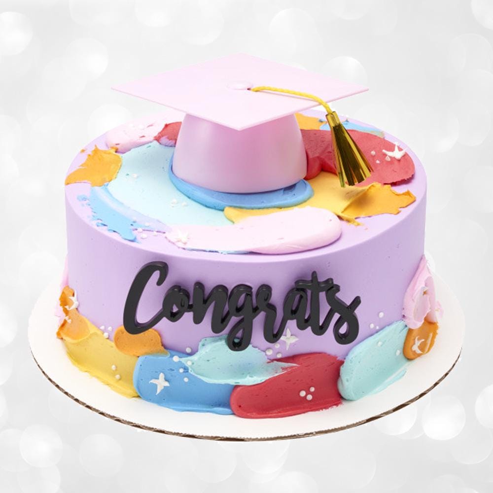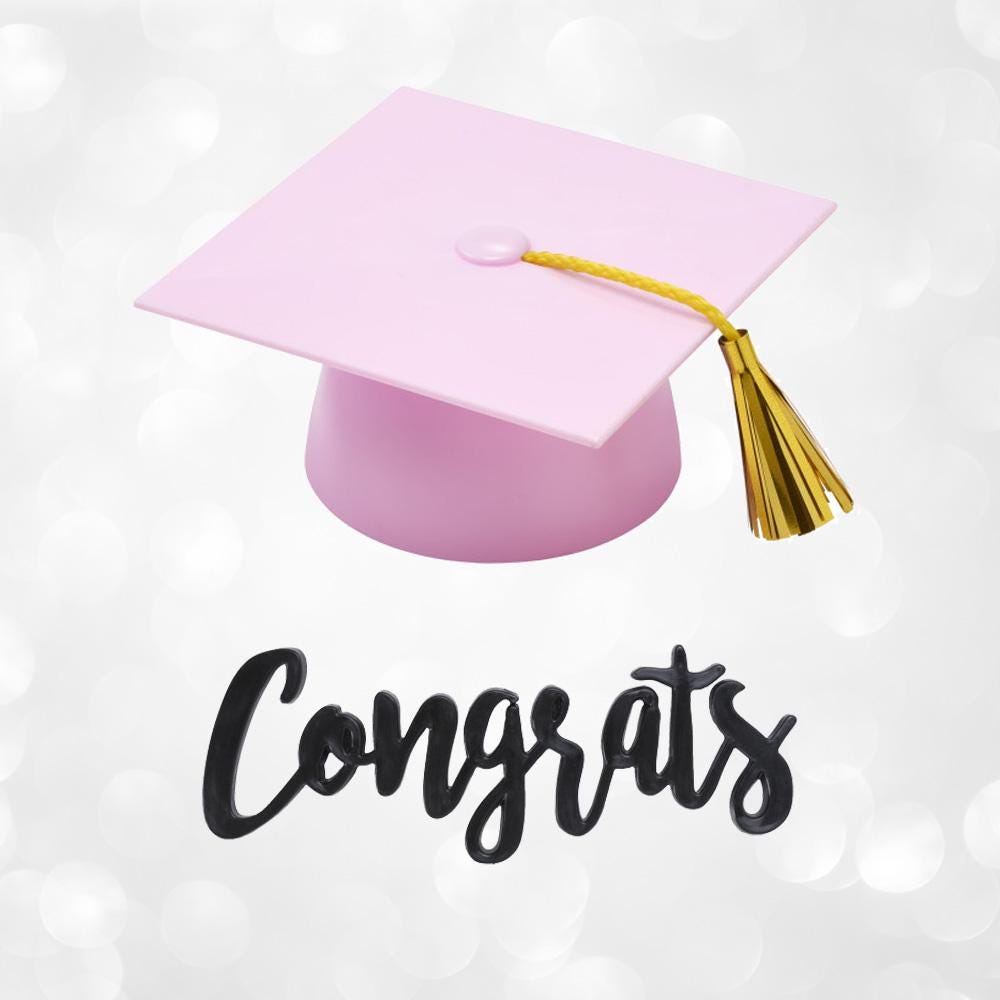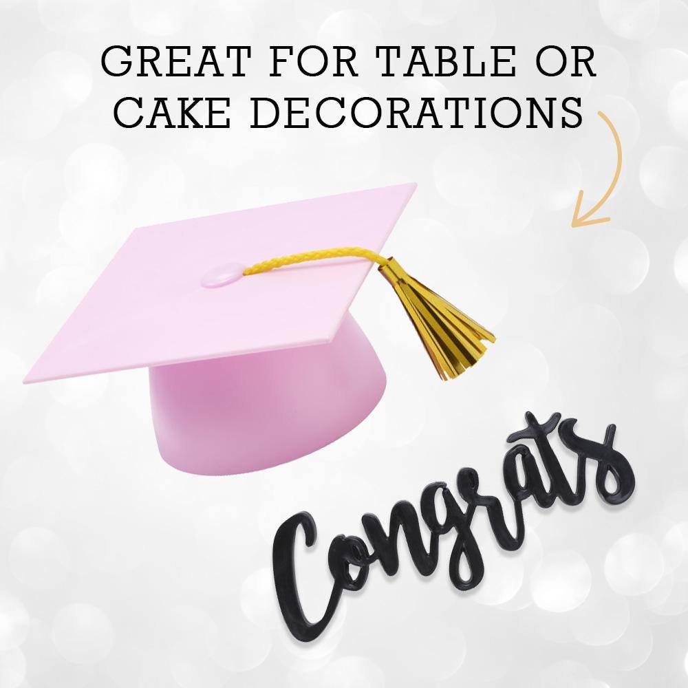 Make your graduation cake into a memorable centerpiece with this pink graduation cap cake topper featuring a gold tassel and black Congrats sign. This versatile cake set can be used for any graduation celebration, creating a stunning accent that honors this special achievement.