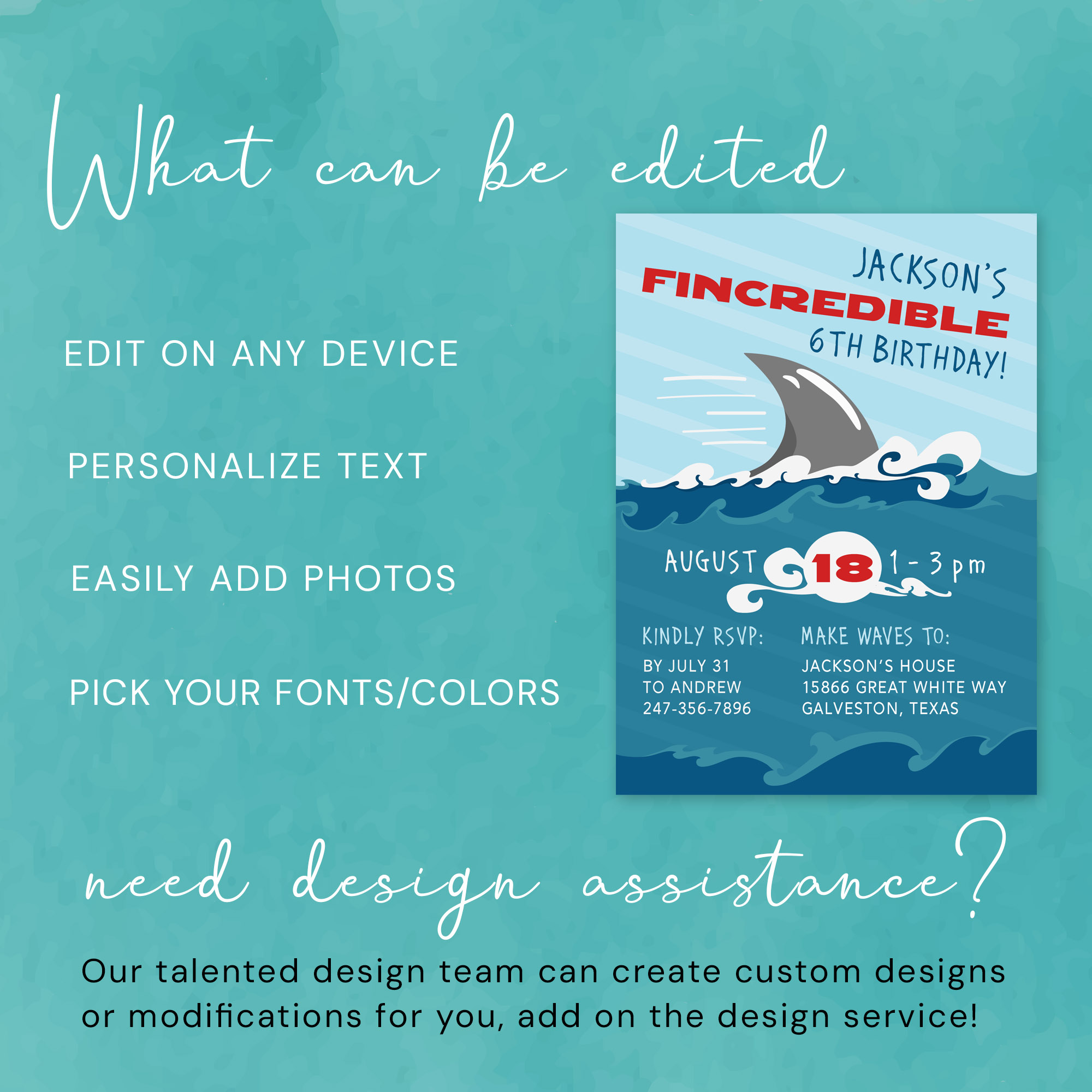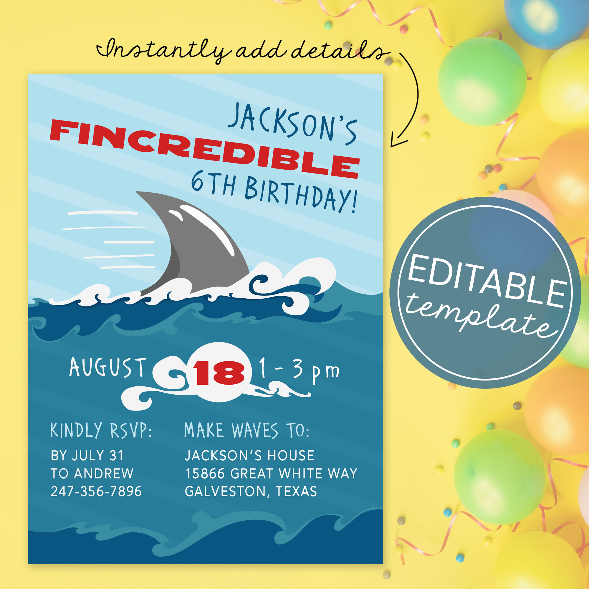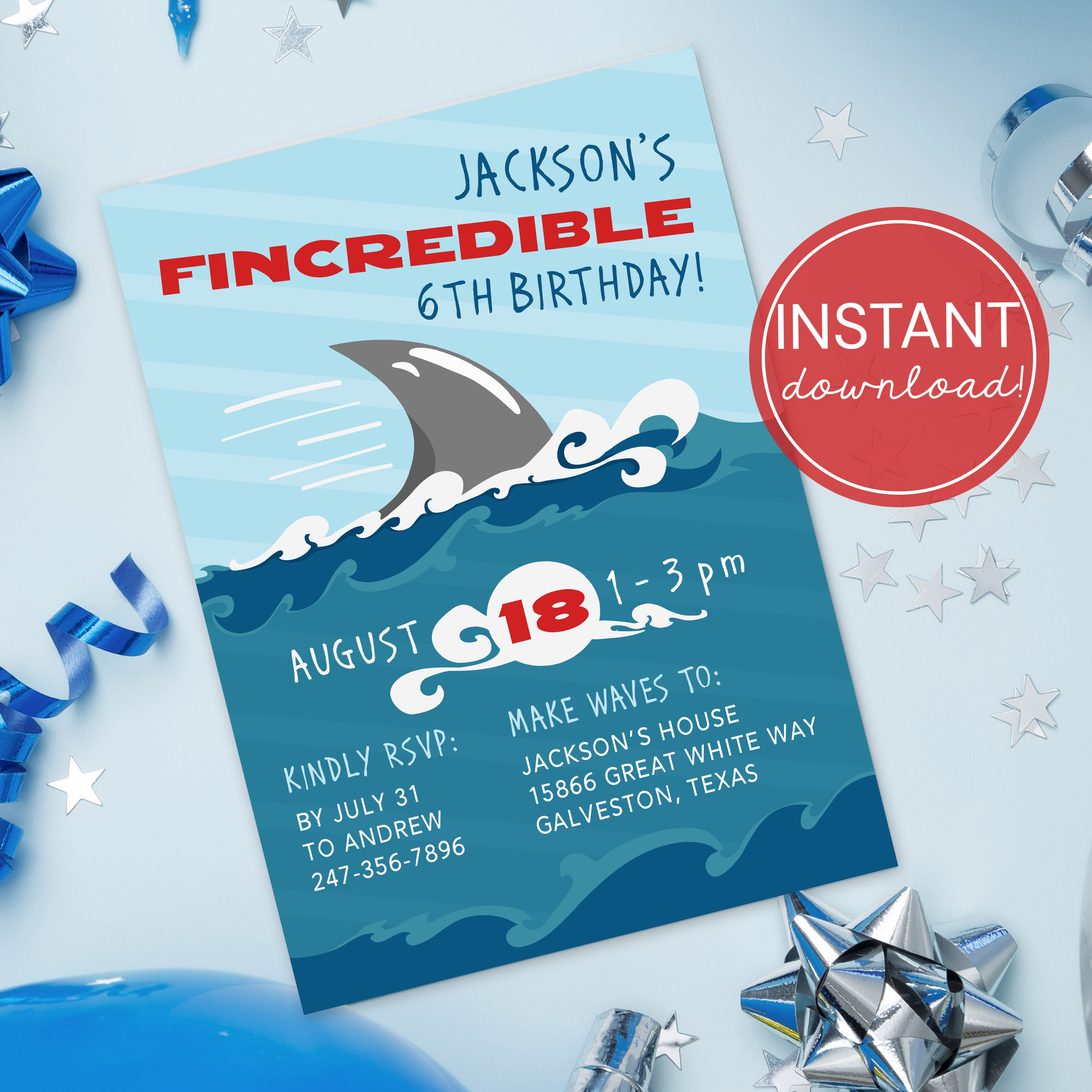 🦈 Shark Infested Birthday Invite: https://designsbyuniquelyyou.etsy.com/listing/4312091854