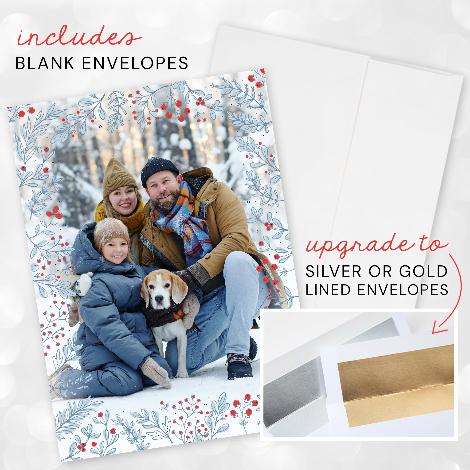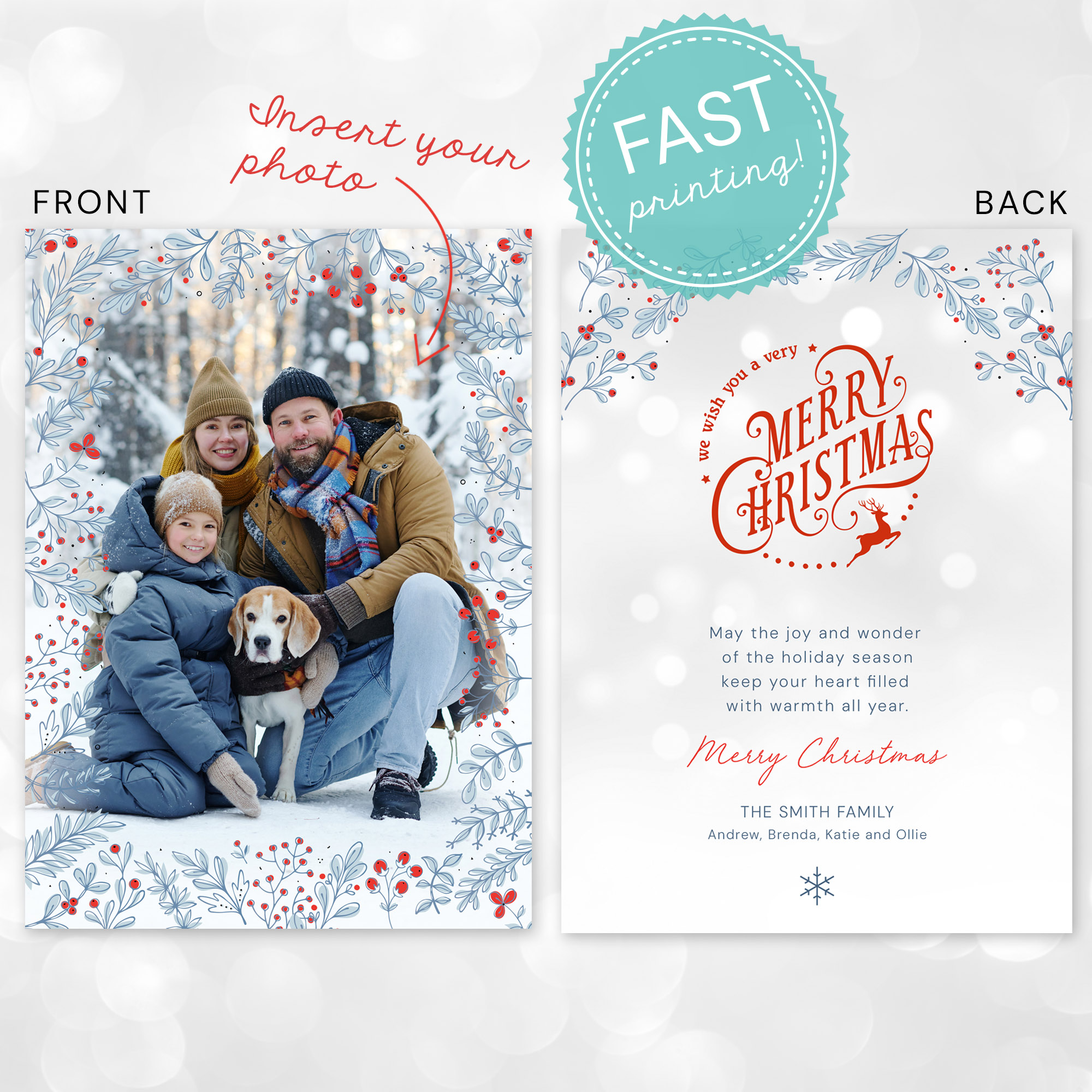 Very Merry Christmas Family Photo Holiday Card captures your family photo and holiday greeting with an elegant winter floral and holly berry design! The front can be personalized with one photo and the back design includes a custom greeting. 5″ x 7″ holiday photo cards are printed on high-quality, smooth matte paper stock and come with plain white envelopes.