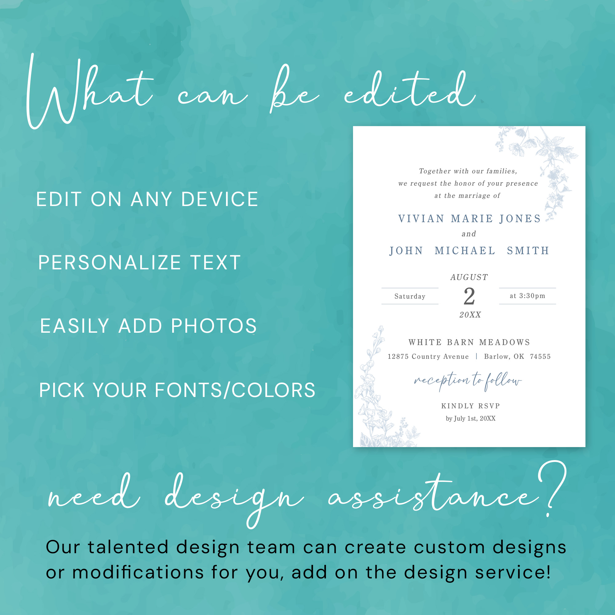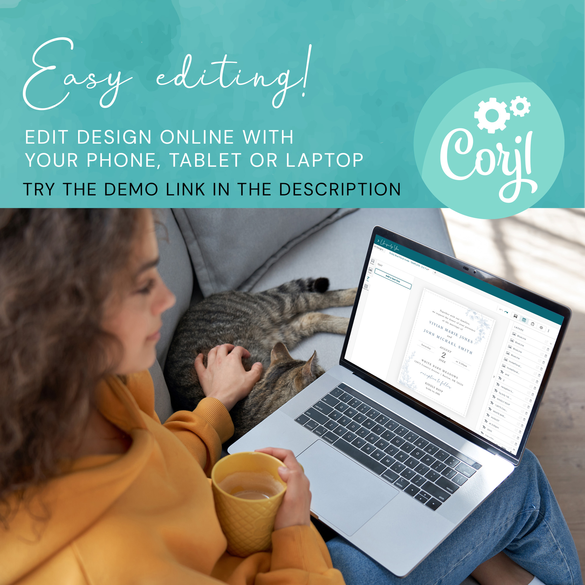 Design can be fully edited using Corjl – a free template editor that allows you to quickly and easily personalize our digital templates. Template can be edited on a computer, tablet or phone.