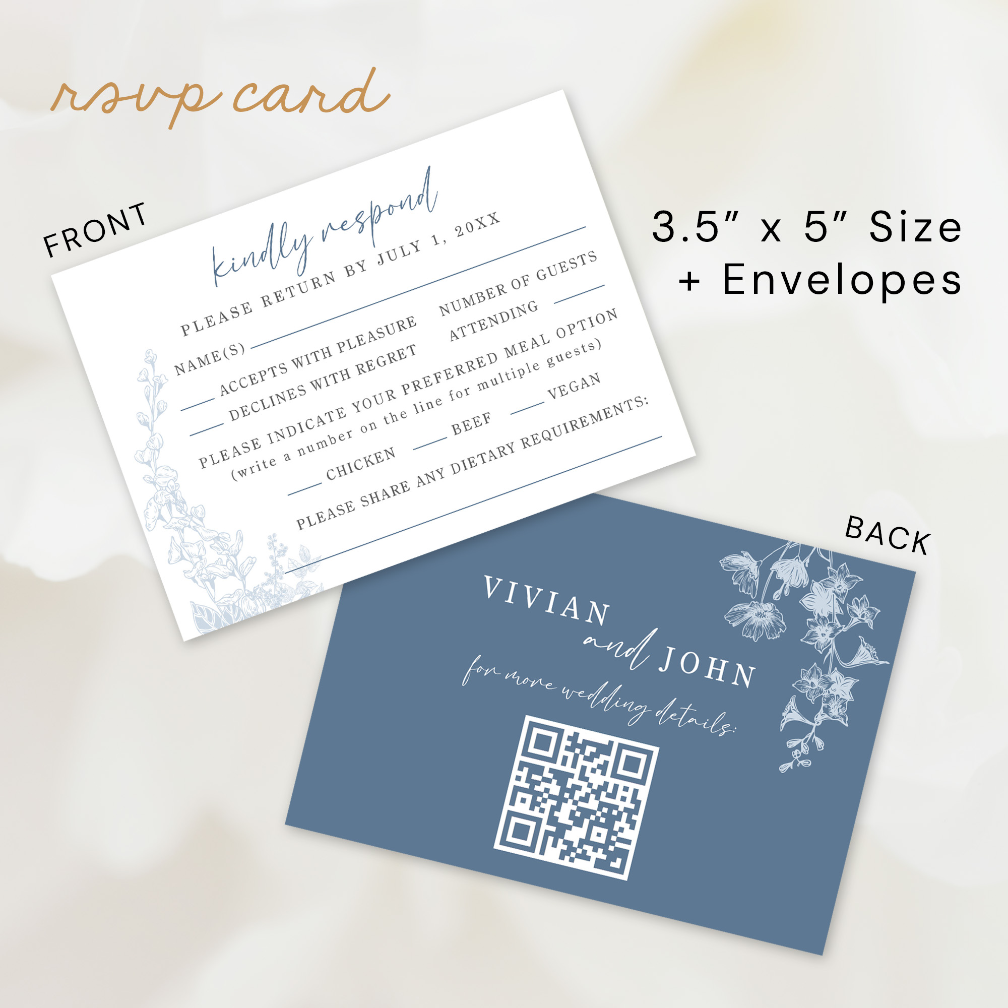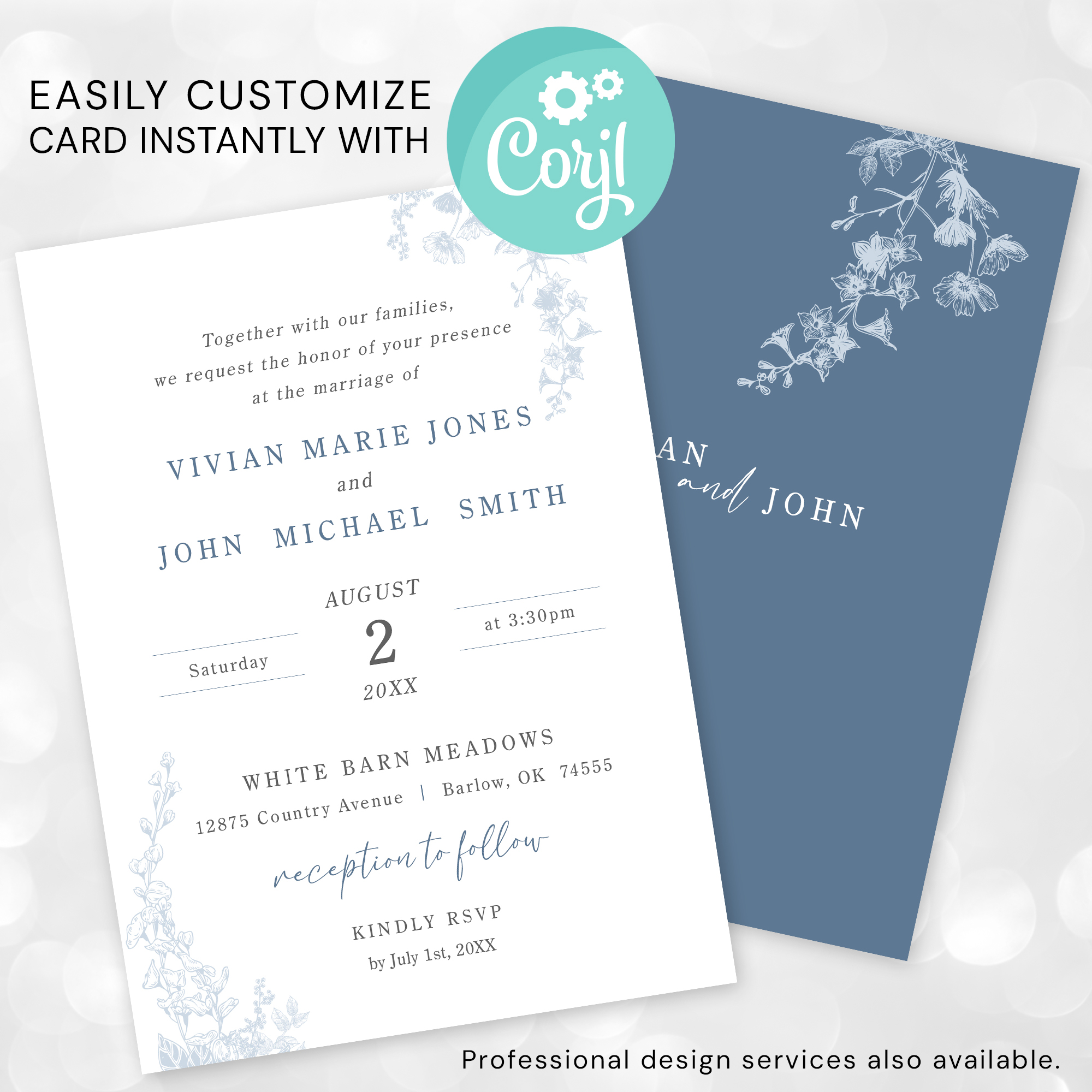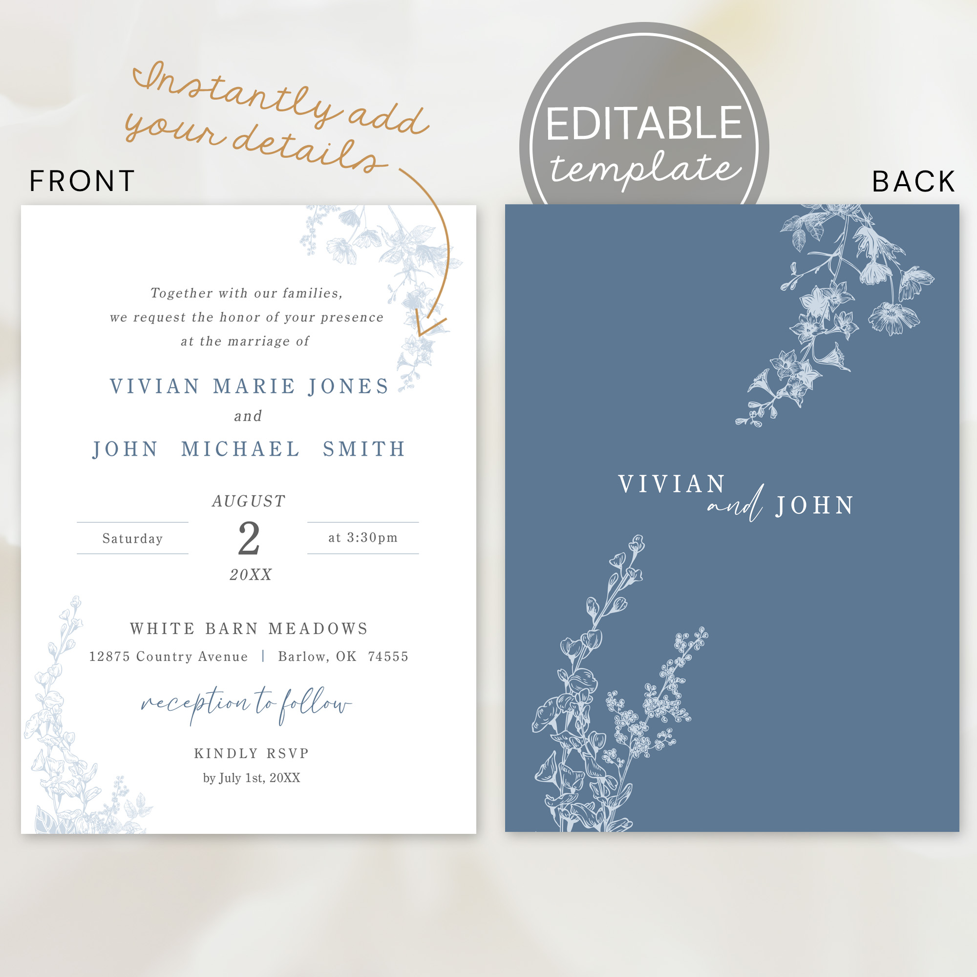 – Beautifully designed double-sided invitation featuring a white side with blue floral patterns and a dusty blue side with white floral patterns