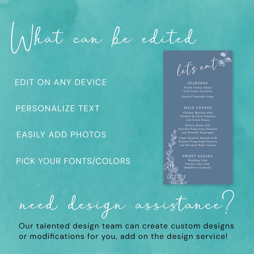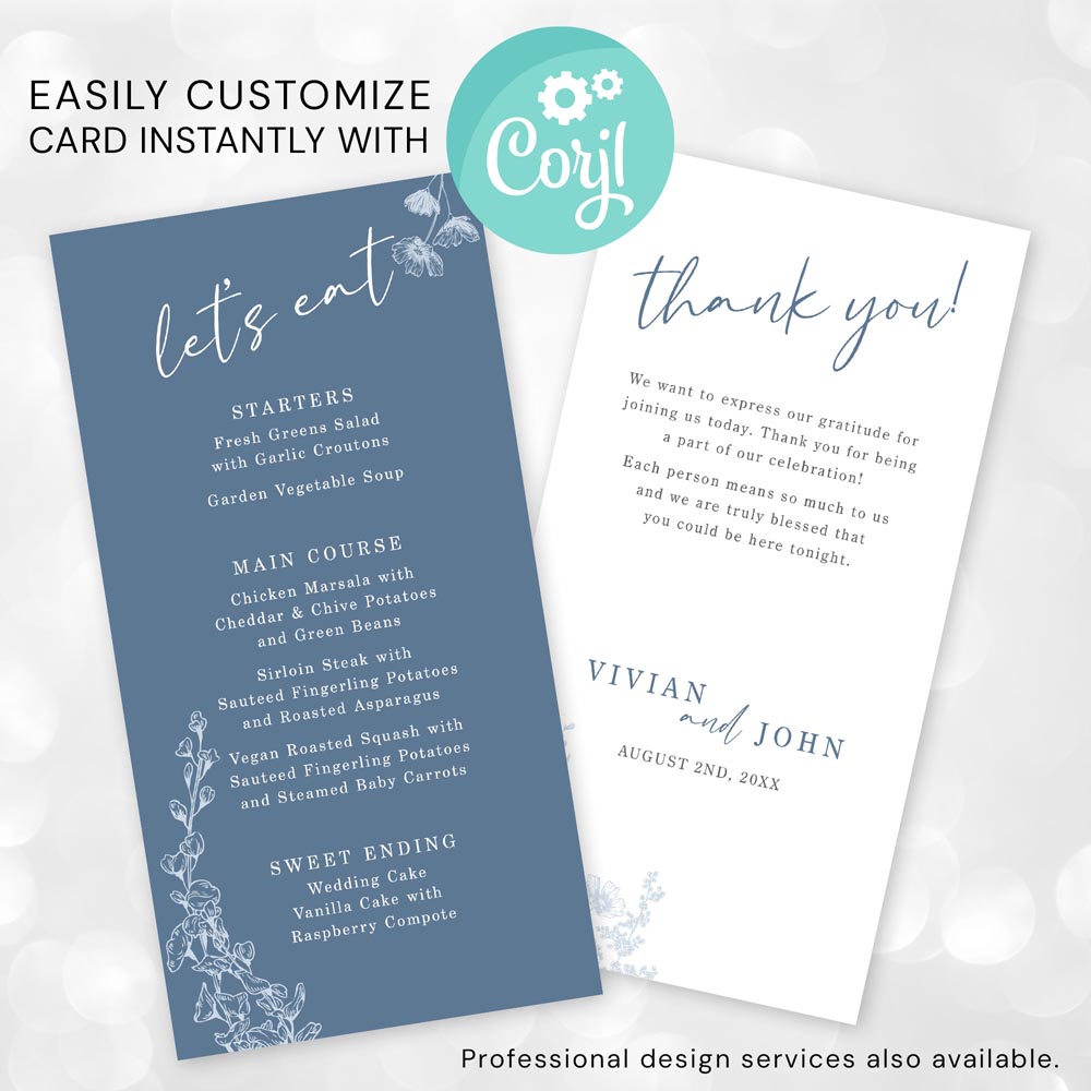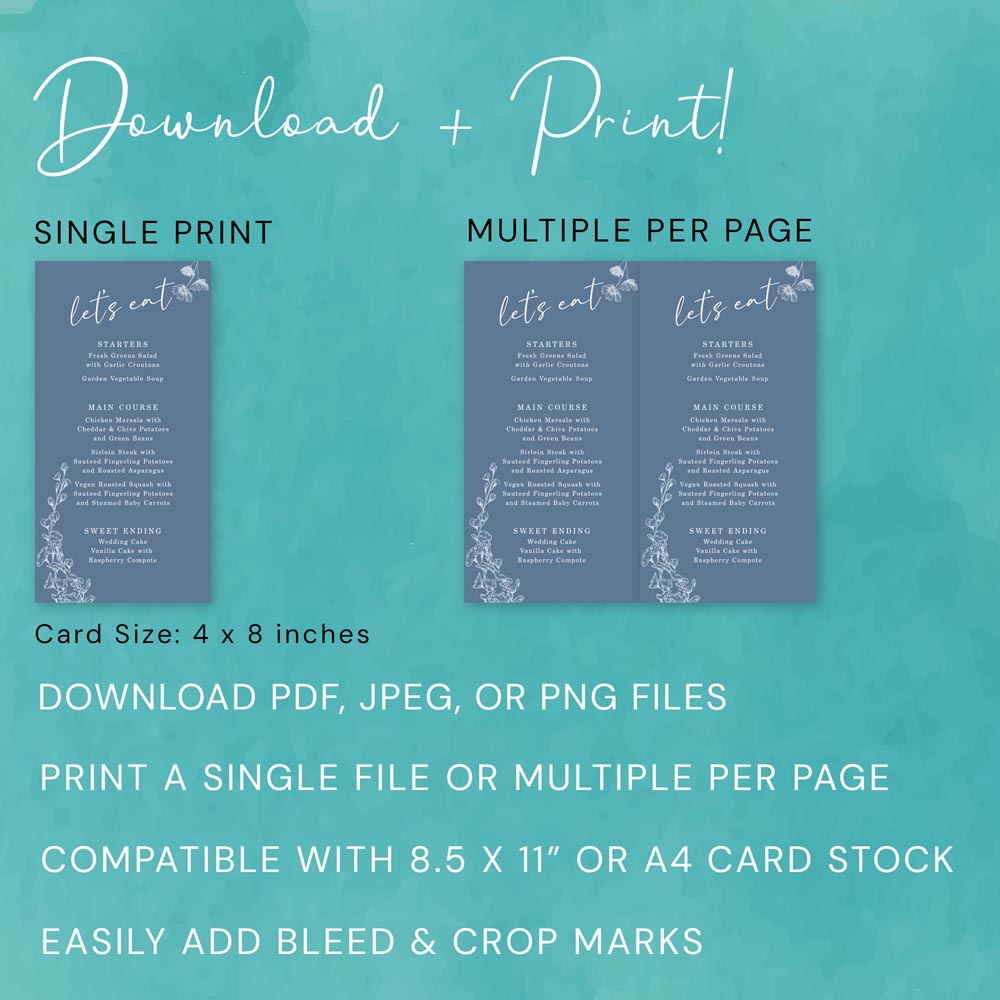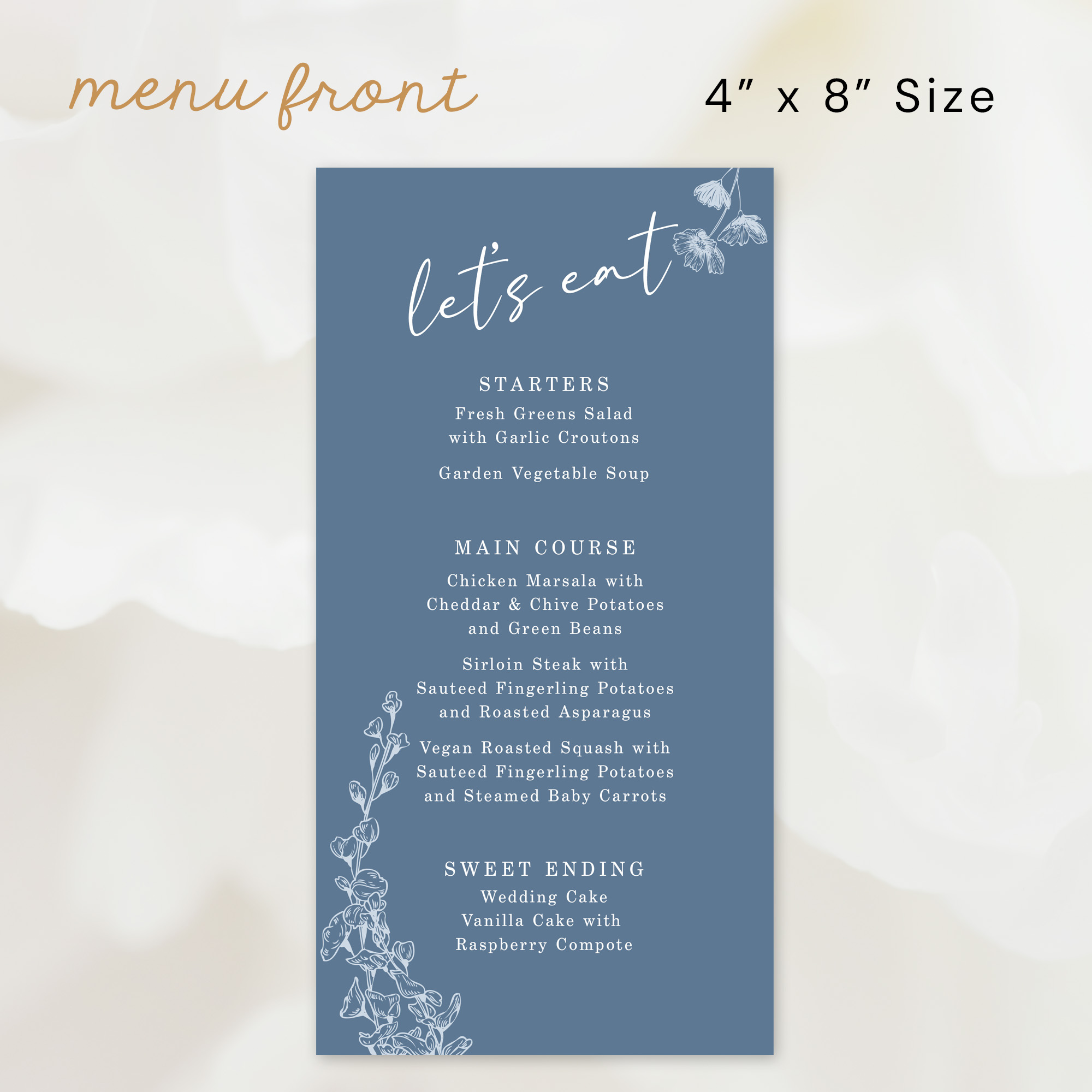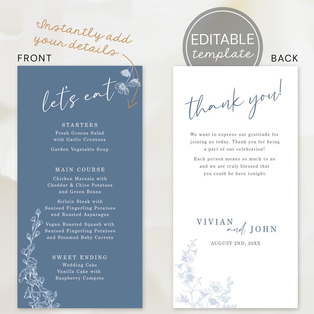 This elegant wedding menu card features a dusty blue background and beautiful white floral illustrations, perfect for reception table decor. It includes sections for starters, main course, and dessert, and the wording is customizable to match your menu offerings. Available as an instant download!