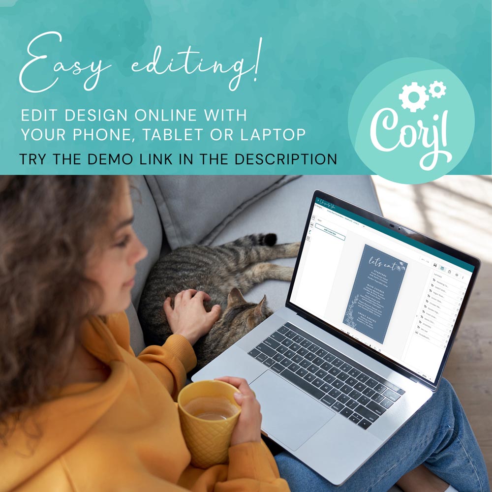 Design can be fully edited using Corjl – a free template editor that allows you to quickly and easily personalize our digital templates. Template can be edited on a computer, tablet or phone.