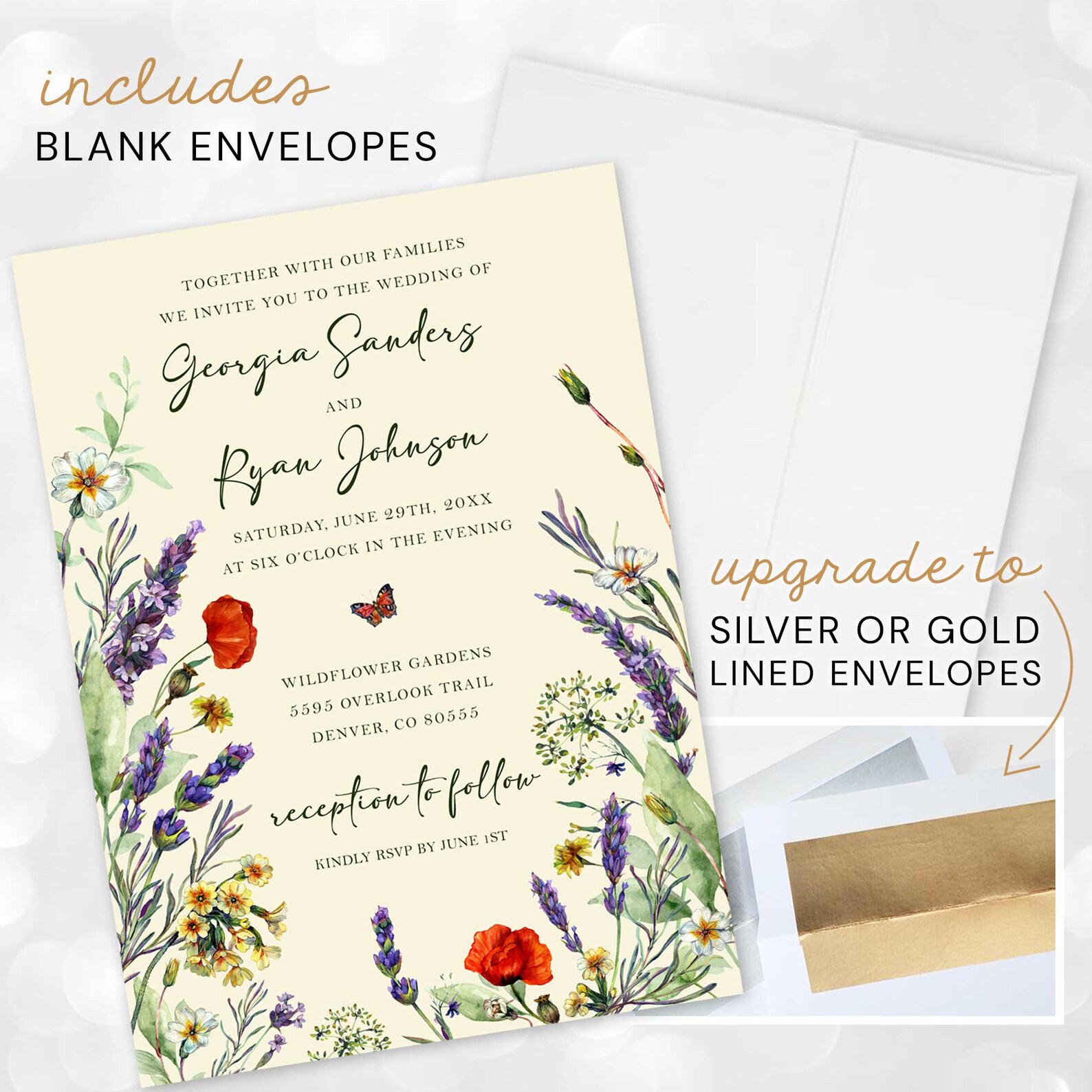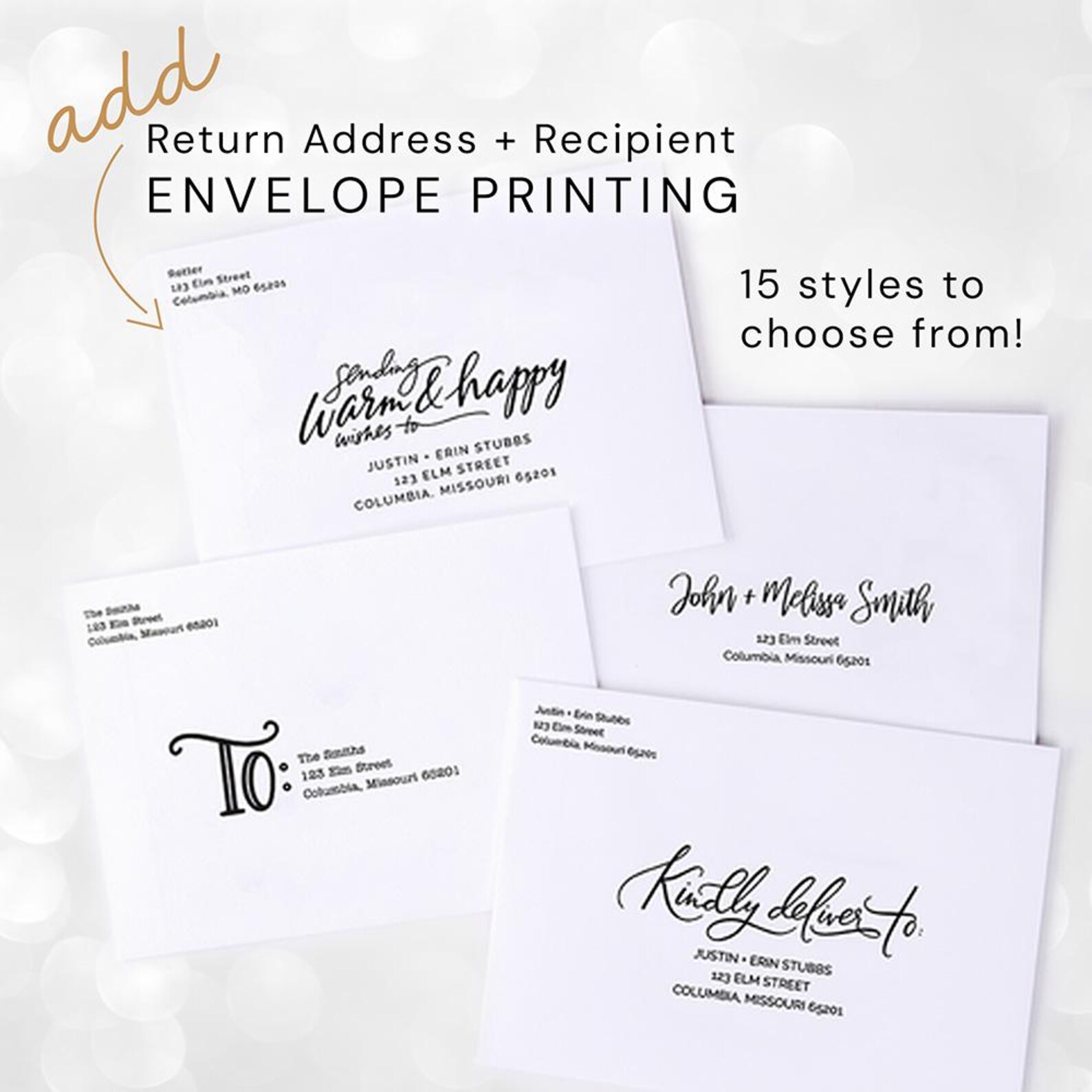 Enhance your invitations by upgrading your envelopes, adding your return address, or print guest recipient addresses directly on the envelopes. Please message us for more information on these time-saving upgrades!