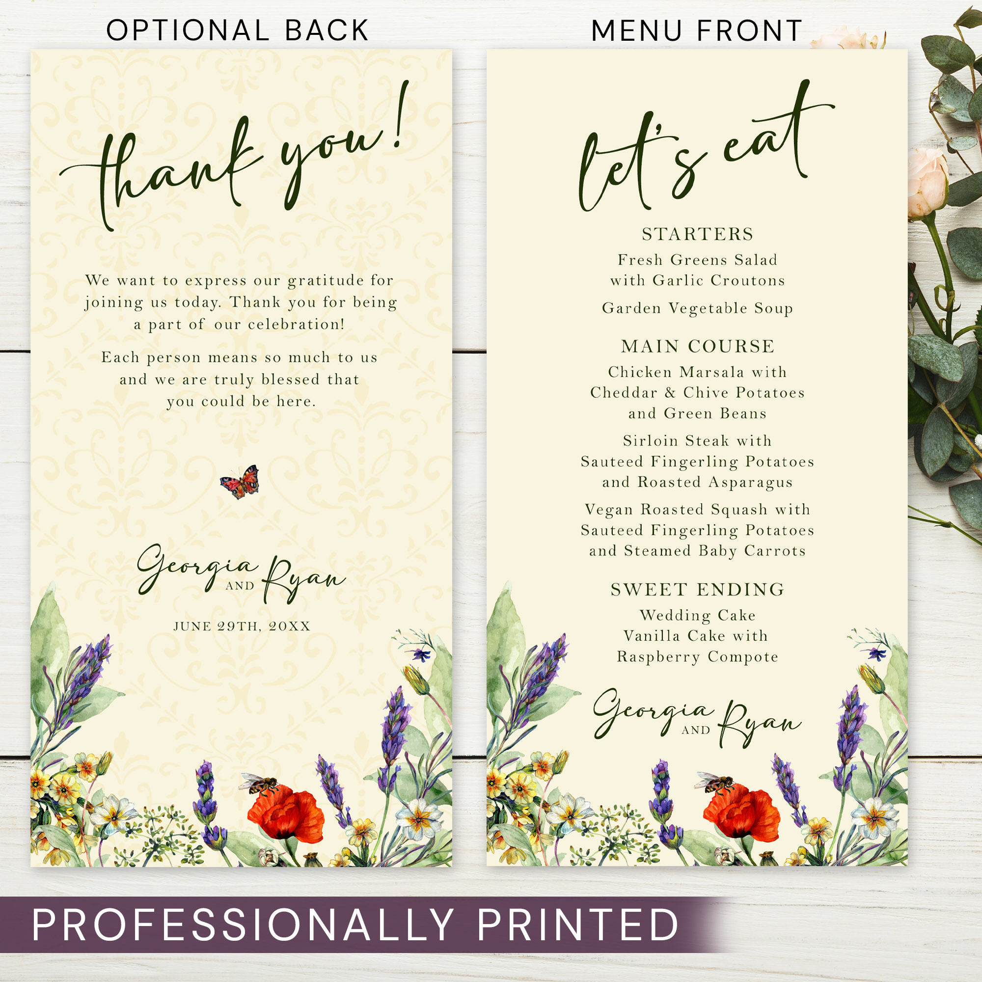This whimsical garden floral wedding menu card features wildflower and butterfly illustrations, perfect for reception table decor. It includes sections for starters, main course, and dessert, and the wording is customizable to match your menu offerings. Optional back design for thank you message or event program.