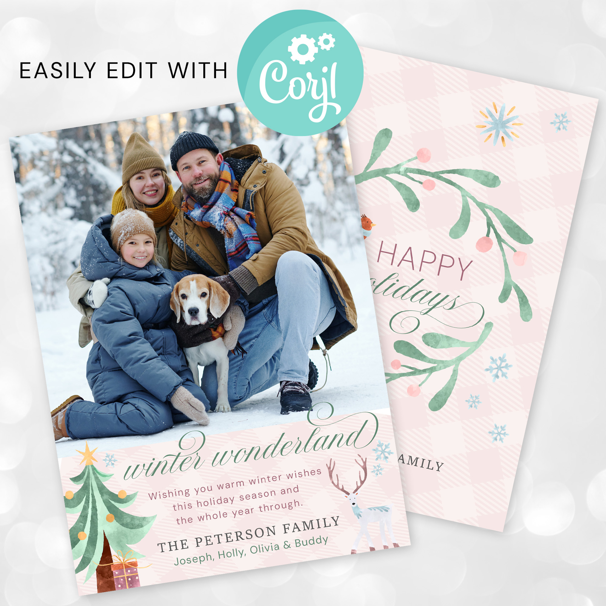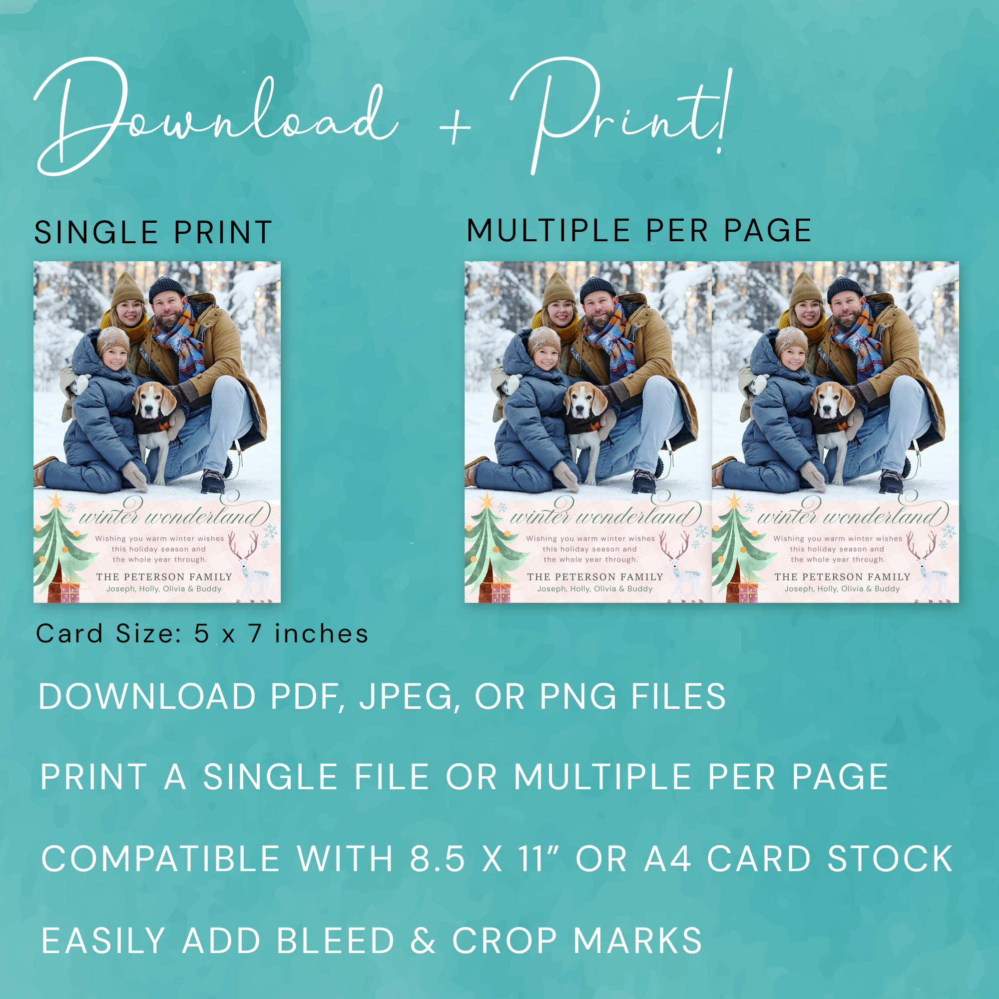 Create a magical holiday greeting with this enchanting Winter Wonderland Christmas card template, perfect for showcasing your family portrait with a customizable digital download design that you can access instantly. This double-sided holiday card template allows you to easily add your own family photo, personalize your greeting text, and create a printable Christmas photo card that perfectly captures your family’s holiday spirit.