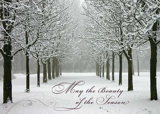 The Winter Wonderland Holiday Card captures the beauty of fresh snow that has just fallen on the trees.