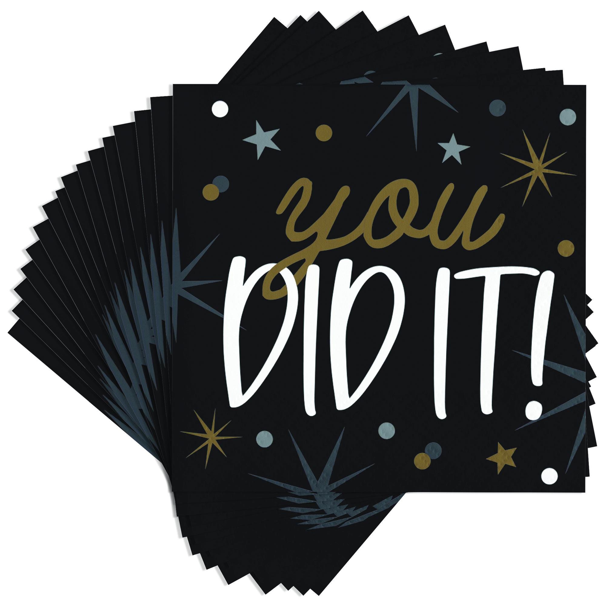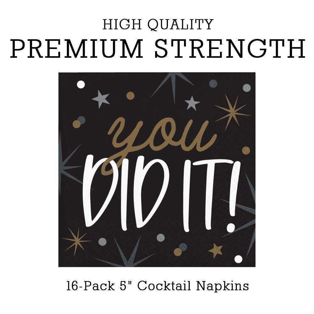 Make your graduation party unforgettable with these striking "You Did It" Cocktail Napkins. Featuring a modern mix of deep black, shimmering gold & silver accents, and crisp white, these napkins offer a sophisticated look that fits any graduation milestone—from kindergarten to college.
